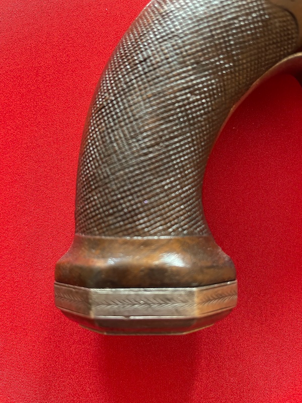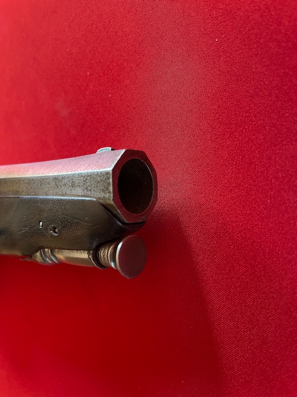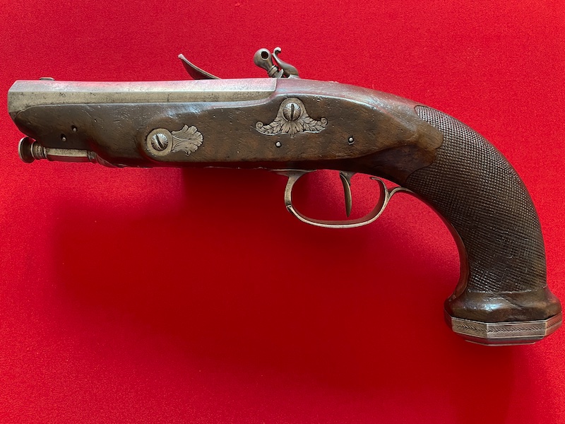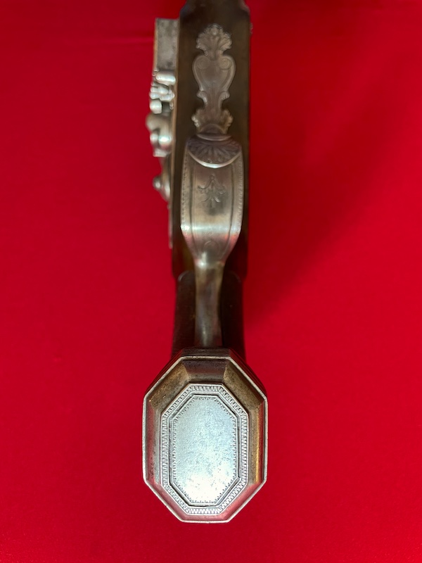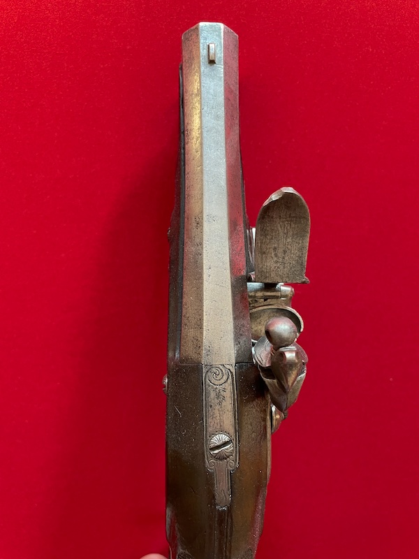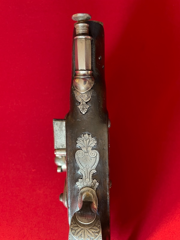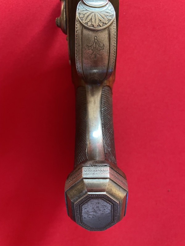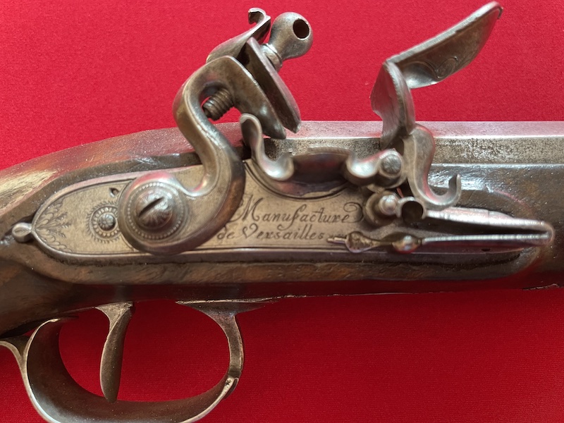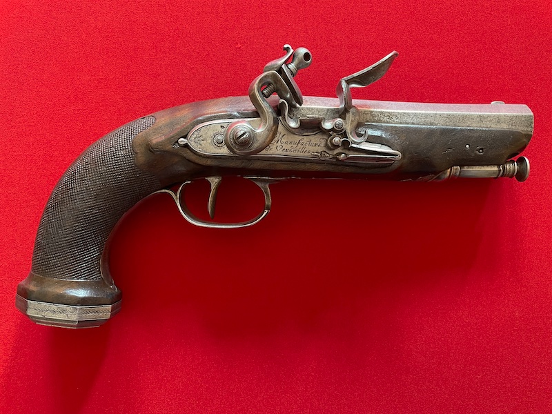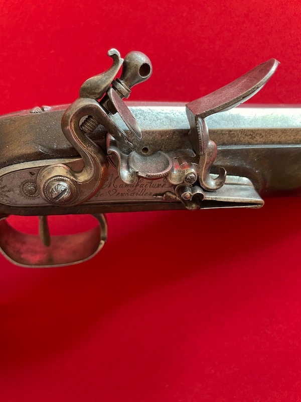 Octagonal, smooth bore barrel, cal. 14 mm, swamped muzzle. Cut flintlock, plate marked “Manufacture de Versailles”. Chiselled iron furniture in relief, walnut stock, chequered butt. Total length: 23 cm, barrel length: 11 cm.
