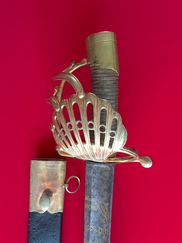 Leicht gekrümmte Klinge à la Montmorency. Messinggefäß mit durchbrochenem Knöchelschild, belederter Hilze und Drahtwicklung. Lederscheide mit Messingbeschlägen . Damaststahl. Vergoldung in guten Zustand.