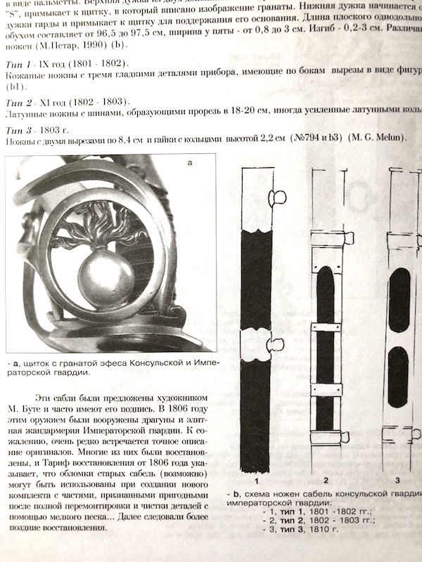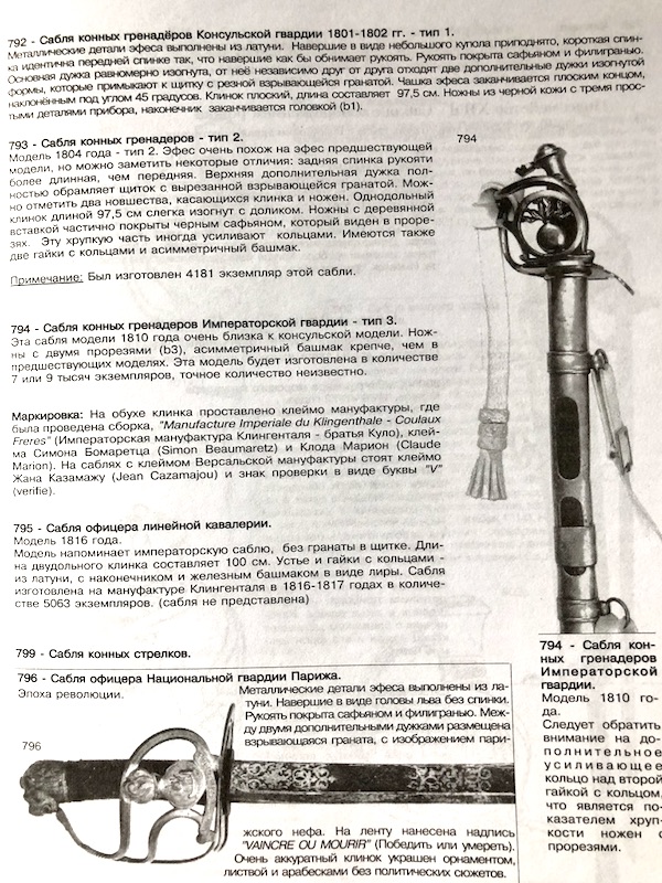 конных гренадер Императорской Гвардии Наполеона, 2-ая модель. Латунный эфес с изображением взрывающейся гранаты, клейма инспекторов фабрики Версаль. Деревянная рукоять, обтянутая кожей, филигрань. Стальной клинок типа Montmerency с гравировкой Klingenthal и клеймами инспекторов C. Marion (1808 -1811) и J.G.Bick (1809-1811). Латунные ножны с кожаными вставками. Длина 116,5 см.