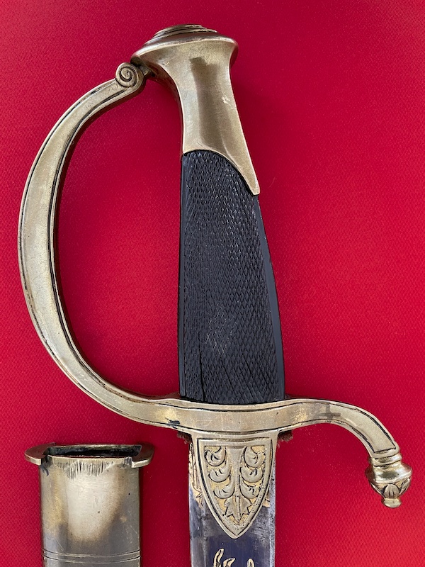 Leicht geschwungene, beidseitig gekehlte Rückenklinge mit vergoldeter Zierätzung auf gebläutem Grund. Bügelgefäß aus Messing mit Mitteleisen und Ebenholzgriff. Leicht geschrumpfte Lederscheide mit Messingbeschlägen.