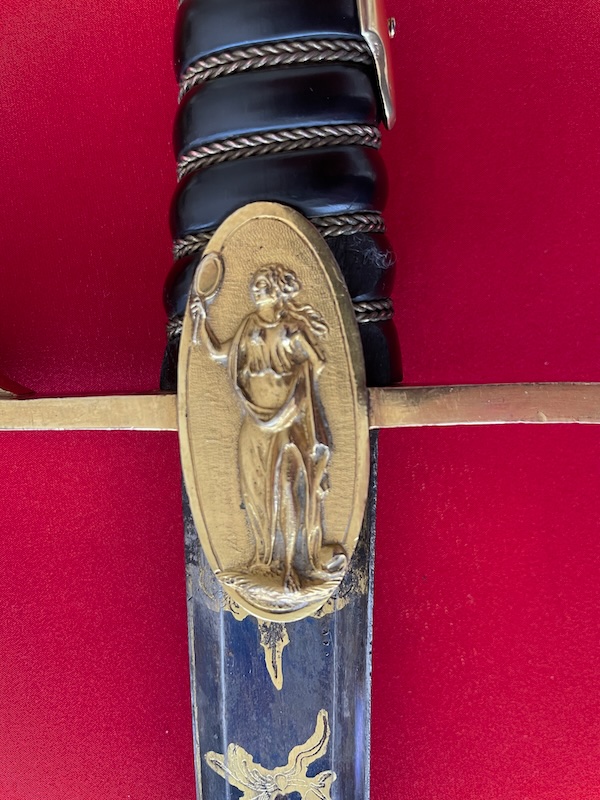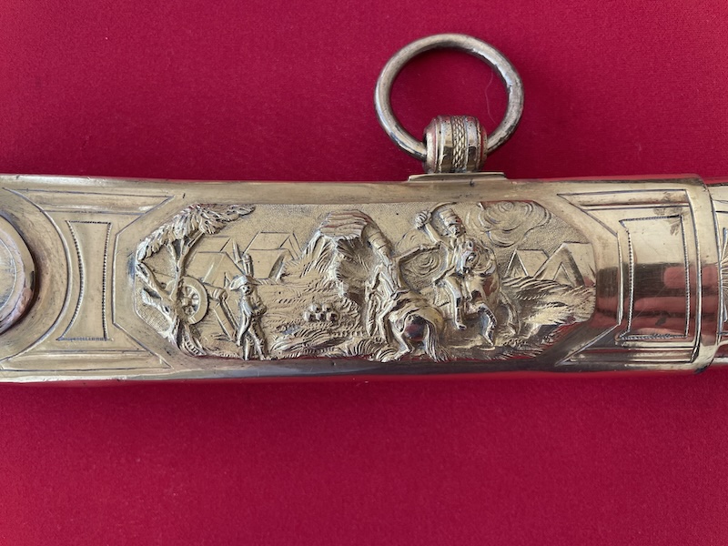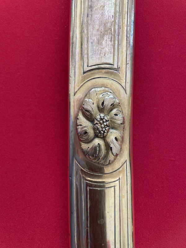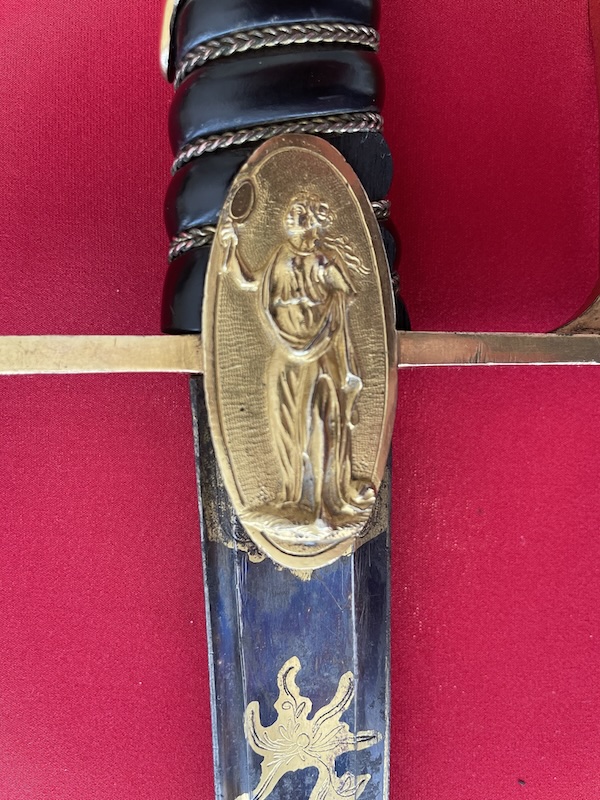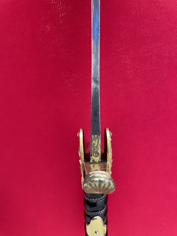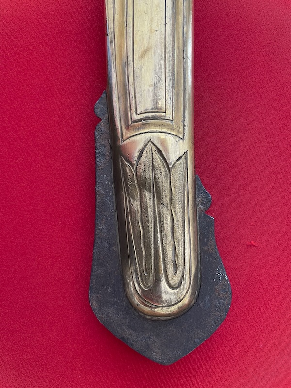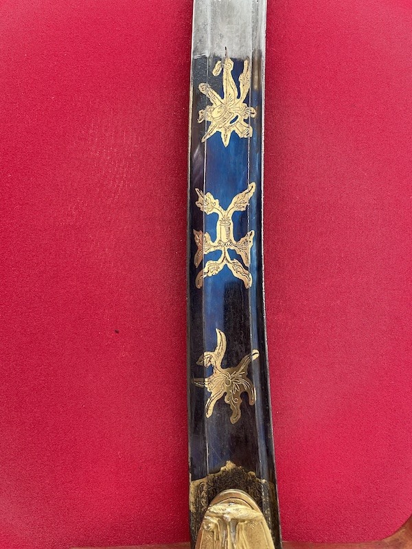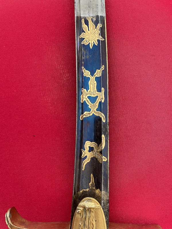 Blade with fullers on both sides and etched, fire-gilt decoration against a blued background.