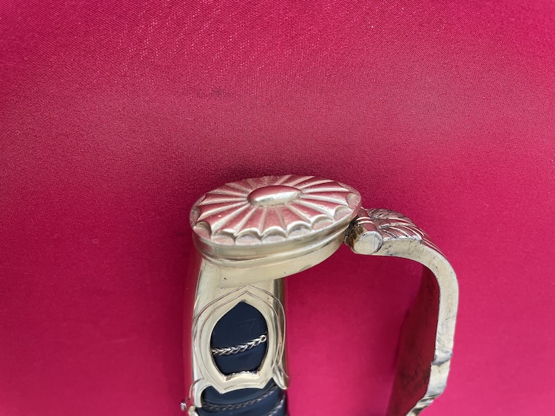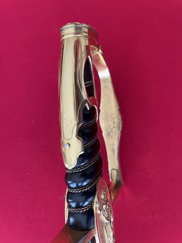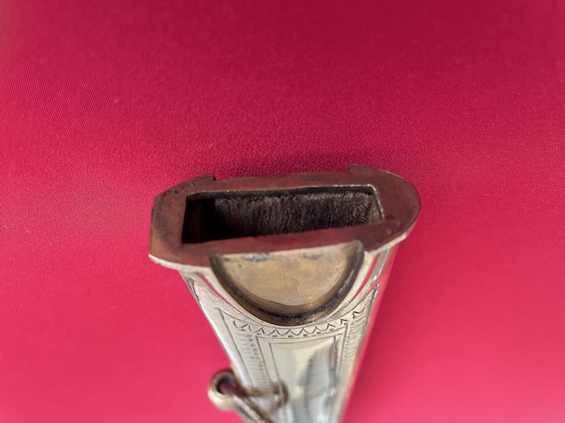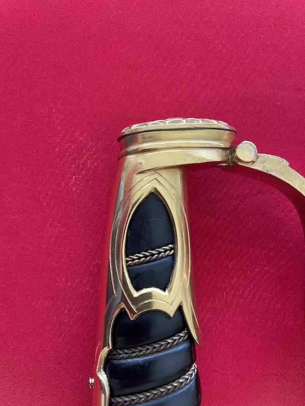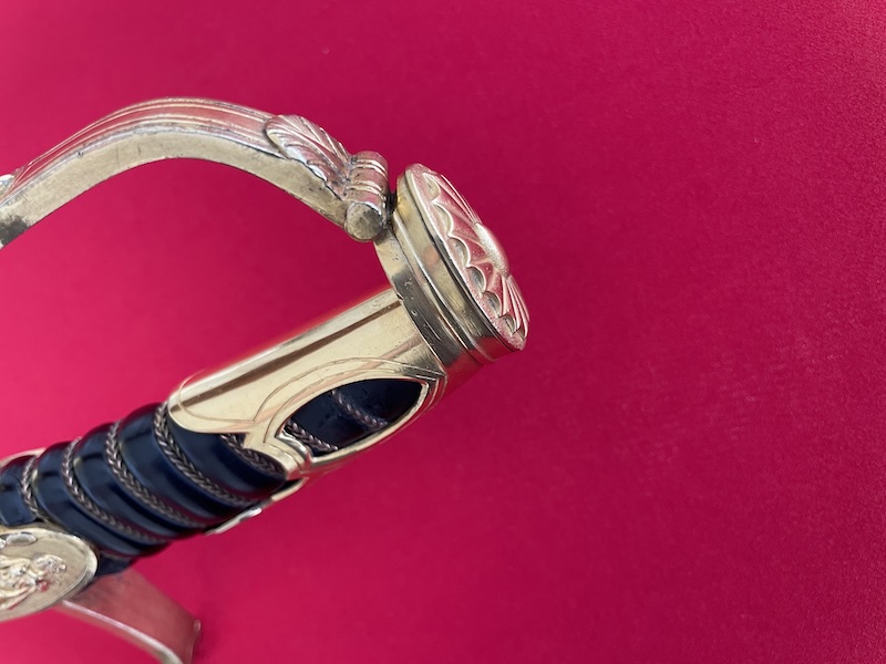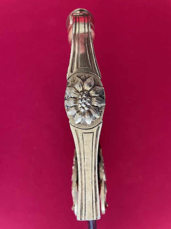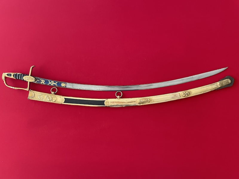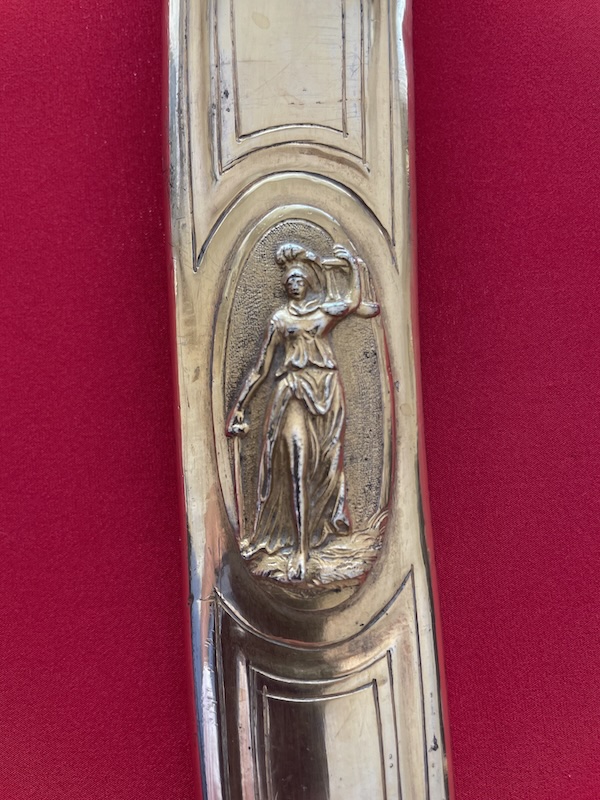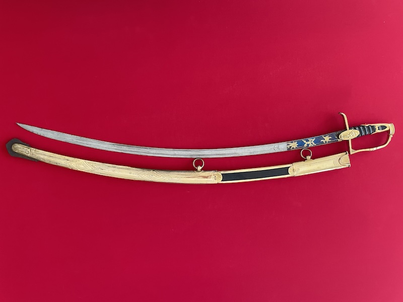 Blade with fullers on both sides and etched, fire-gilt decoration against a blued background.