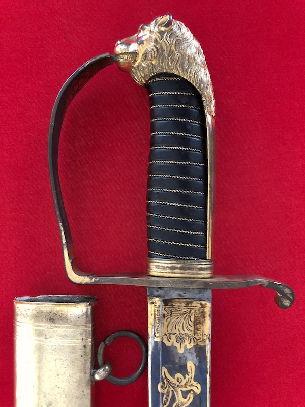 Löwenkopfsäbel der Kavallerie, Rheinbund (1806 - 1813), Klinge im oberen Drittel gebläut und verziert, Goldtausia, dazugehörige Lederscheide mit 2 Trageringen, beledertes Griffstück mit originaler Wicklung, L ca. 99 cm, guter Zustand mit Altersspuren.