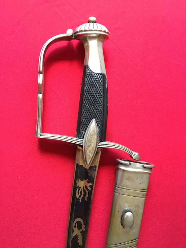 Leicht geschwungene, beidseitig gekehlte Rückenklinge mit vergoldeter Zierätzung auf gebläutem Grund. Versilbertes Bügelgefäß mit Mitteleisen und Ebenholzgriff. Leicht geschrumpfte Lederscheide mit versilberten Beschlägen. Länge 89 cm.