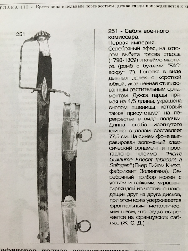 Слегка изогнутый клинок. Позолота и синение клинка в отличном состоянии. Ножны из кожи с латунными вставками.