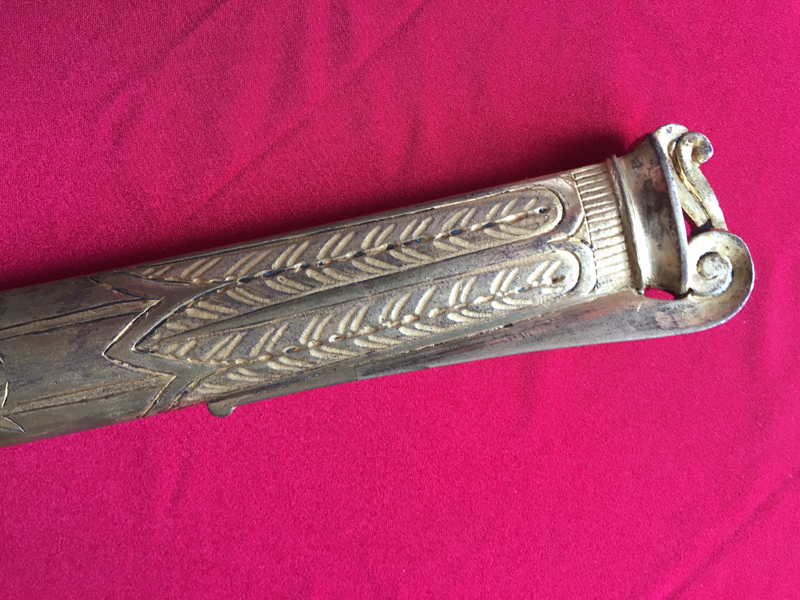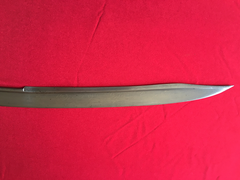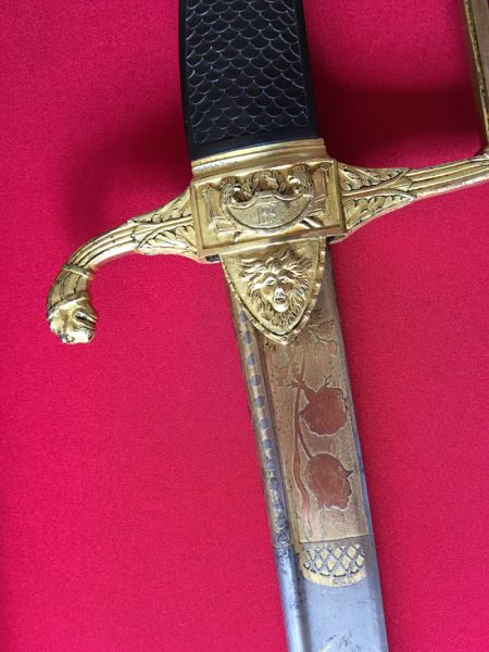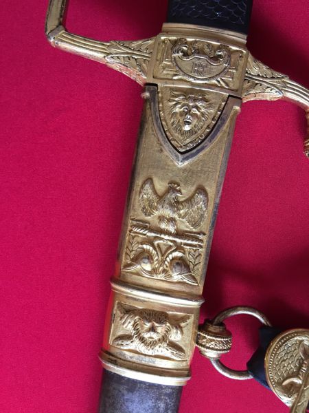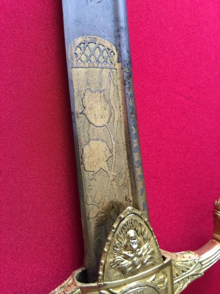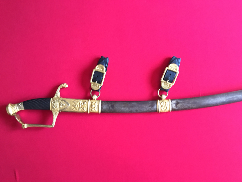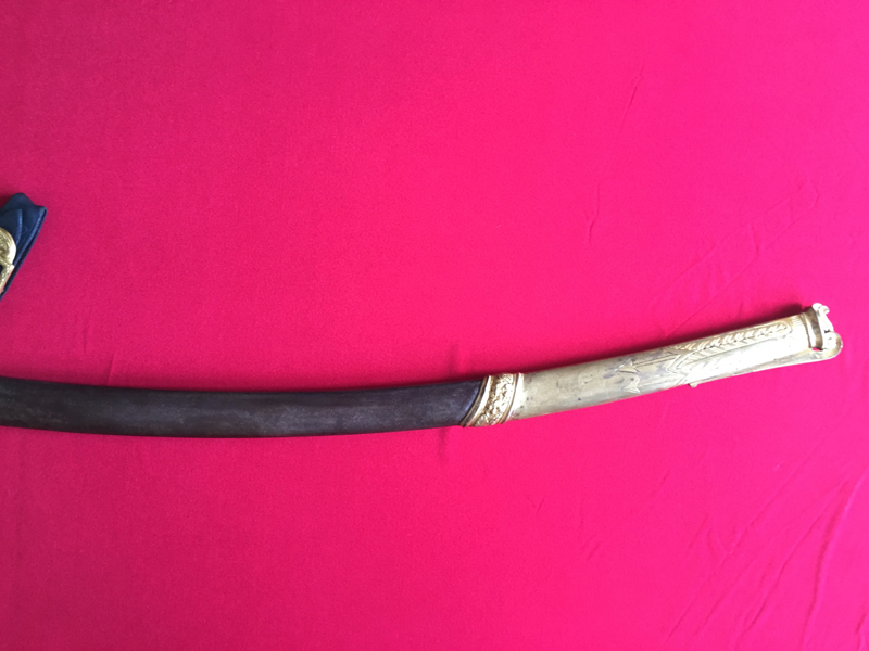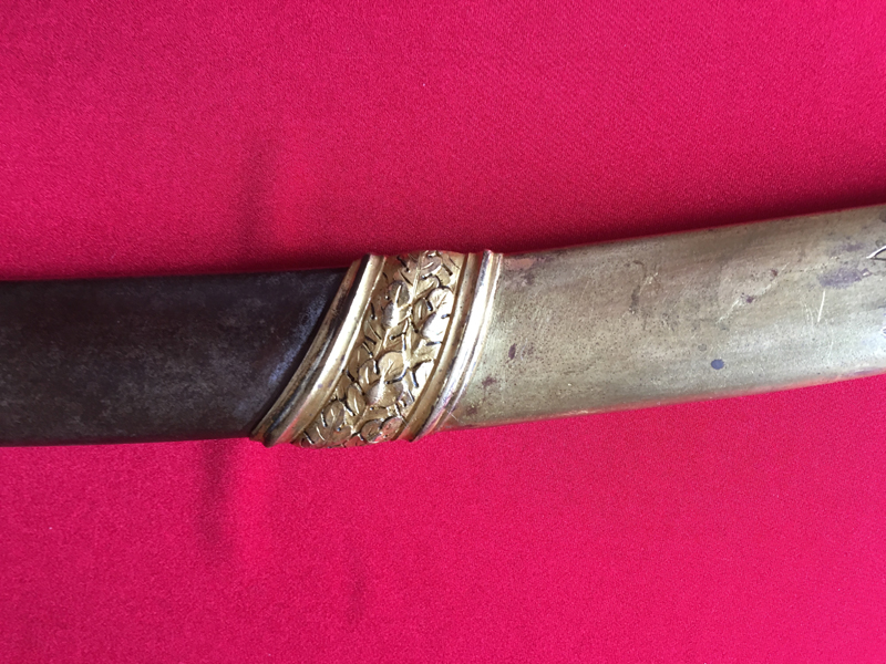 Leicht gebogene, Damast Stahlklinge mit vergoldetem Ätzdekor. Griff in Ebenholz . Bügelgefäß aus vergoldeter Messing. Blanke Stahlscheide mit vergoldeten Messingbeschlägen und Trageringen. Äusserst seltenes Stück, ca 1803.