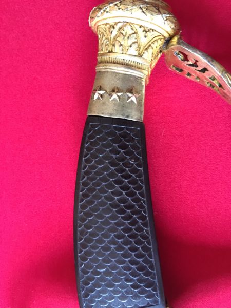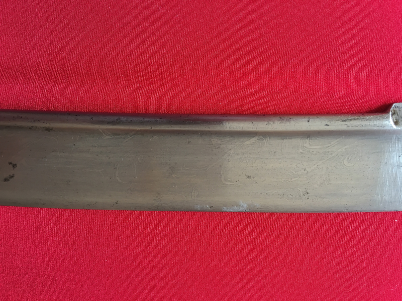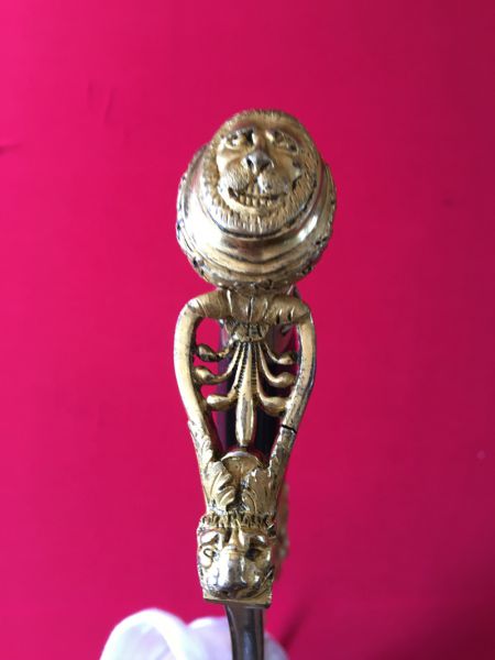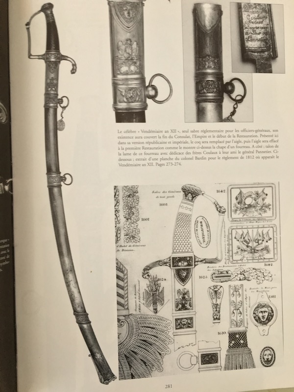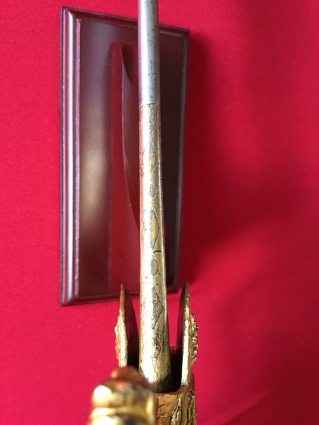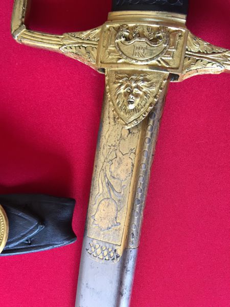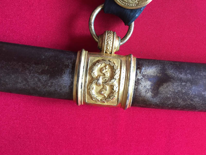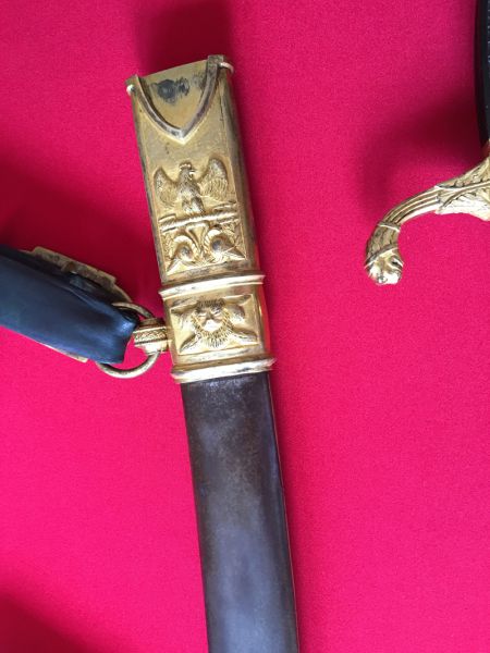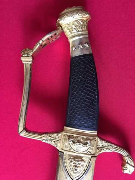Leicht gebogene, Damast Stahlklinge mit vergoldetem Ätzdekor. Griff in Ebenholz . Bügelgefäß aus vergoldeter Messing. Blanke Stahlscheide mit vergoldeten Messingbeschlägen und Trageringen. Äusserst seltenes Stück, ca 1803.