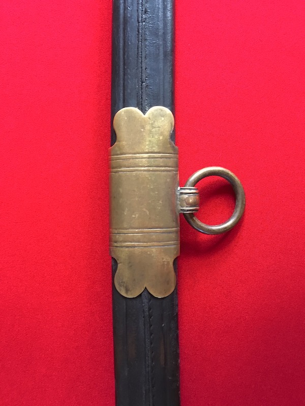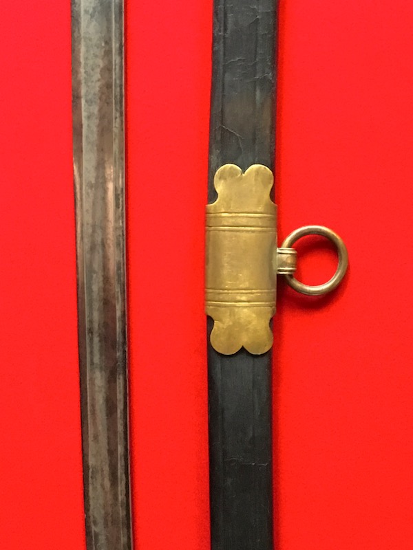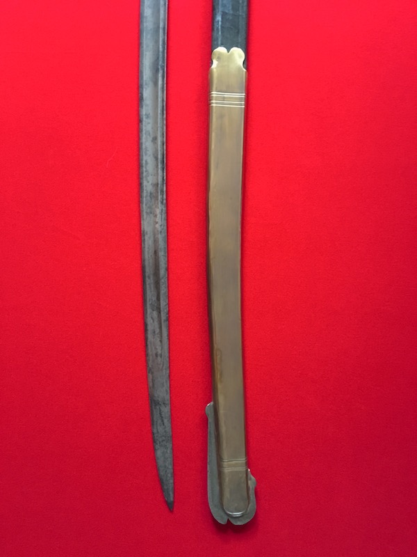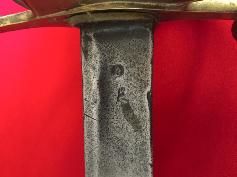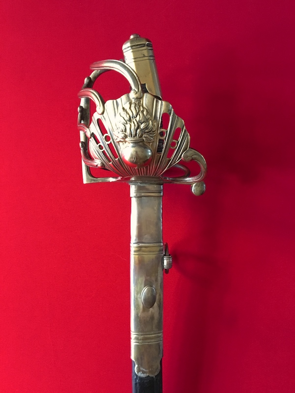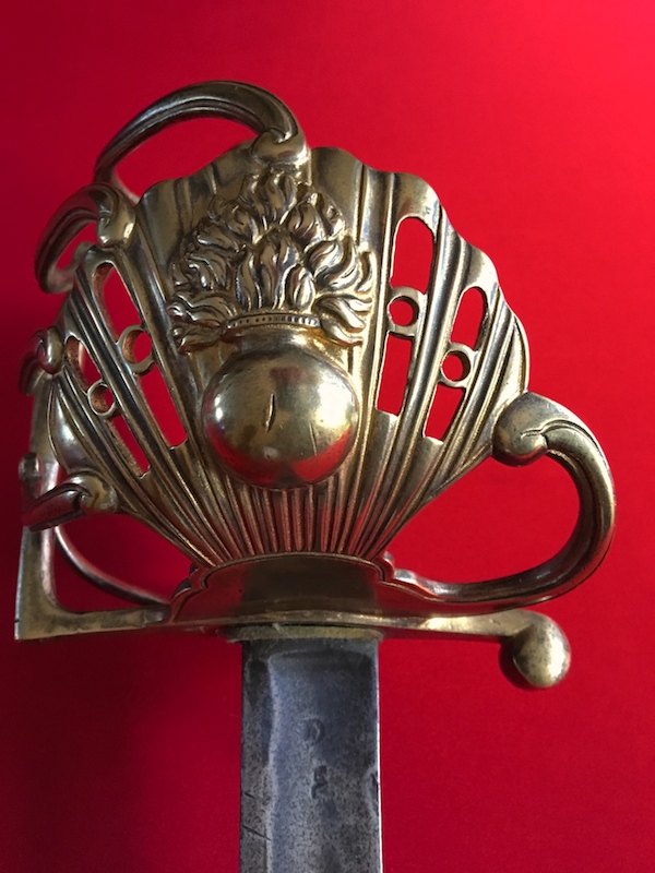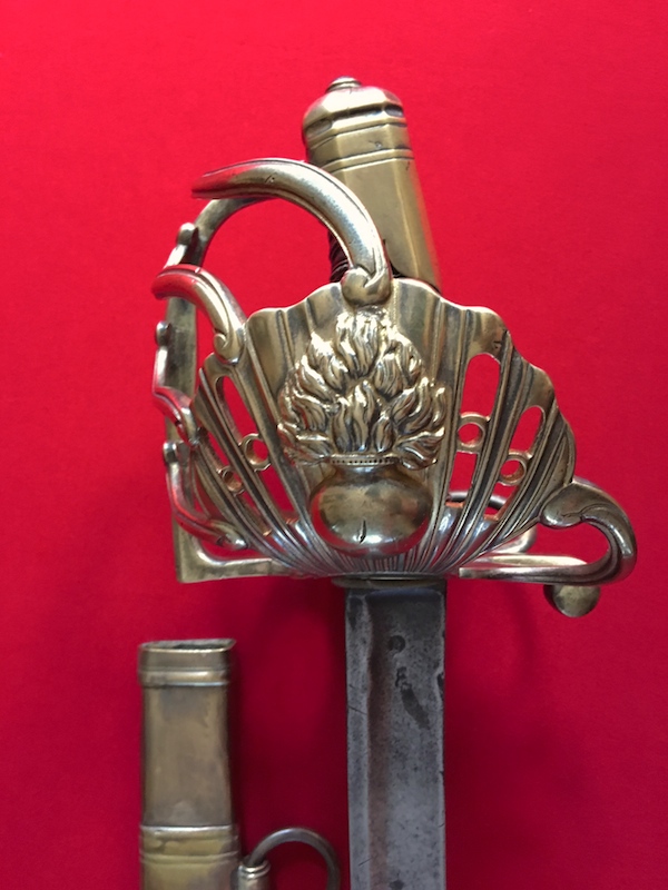 Leicht gekrümmte Klinge à la Montmorency. Die Fehlschärfe am Rücken signiert "Manufacture Klingenthal Coulaux Freres". Messinggefäß mit durchbrochenem Knöchelschild und platzende Granate, belederter Hilze und Drahtwicklung. Lederscheide mit Messingbeschlägen teilweise restauriert.