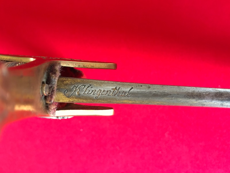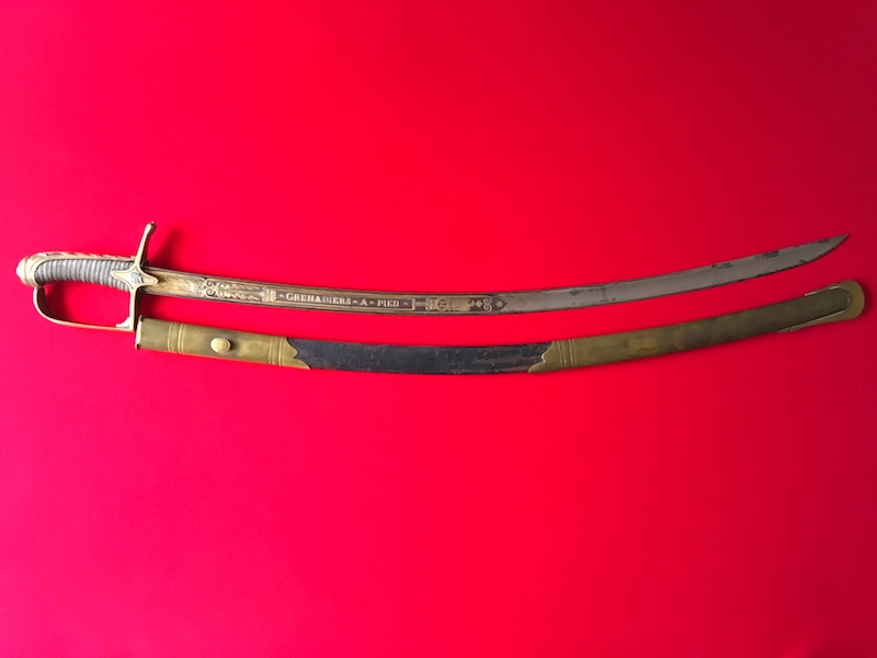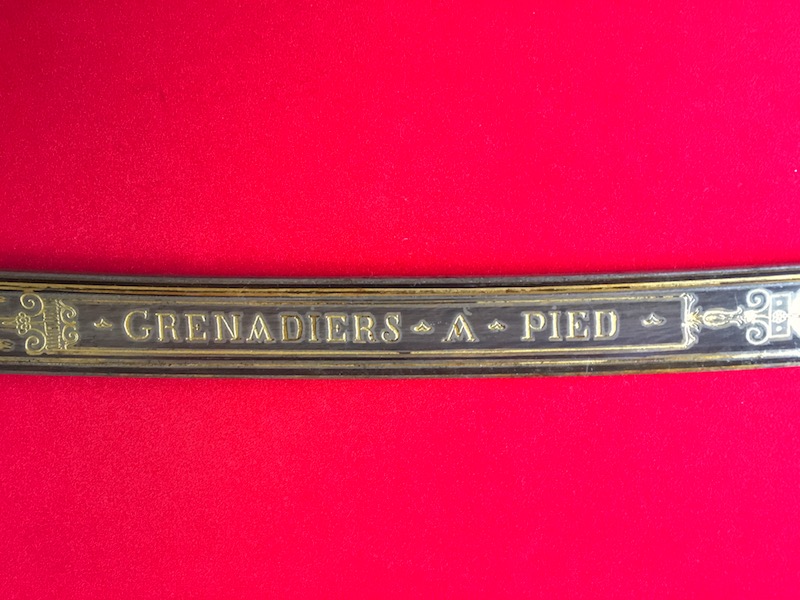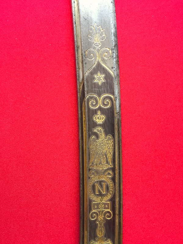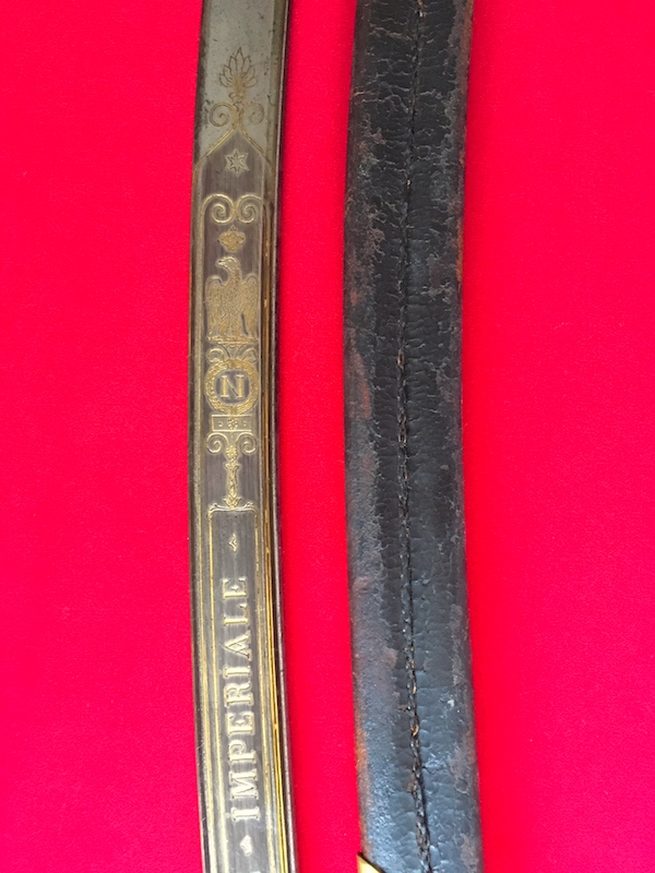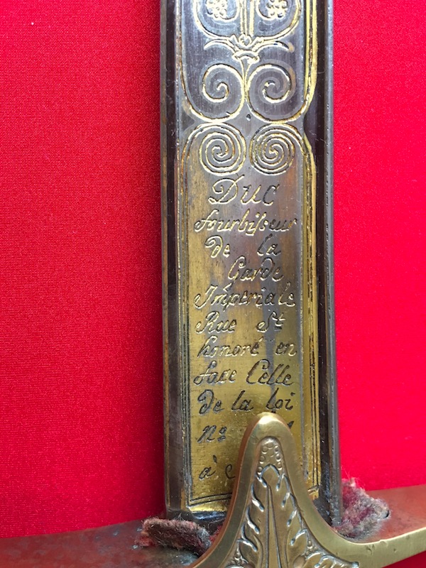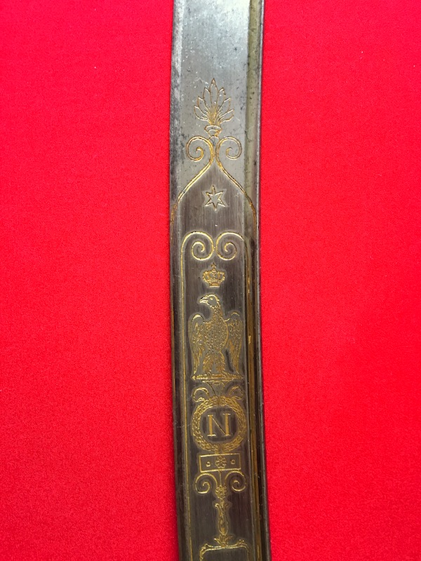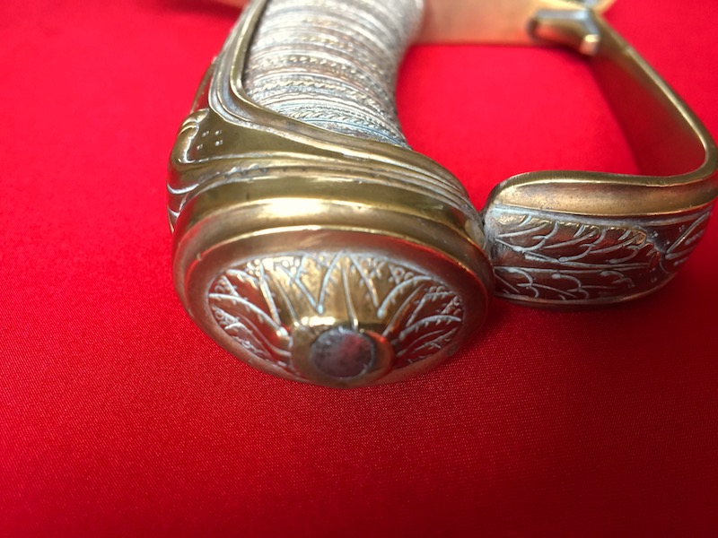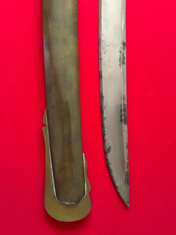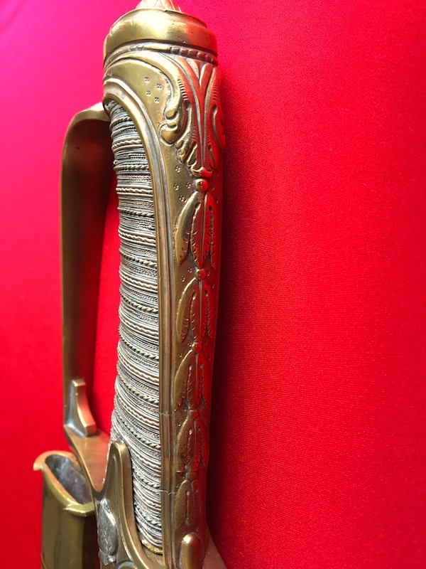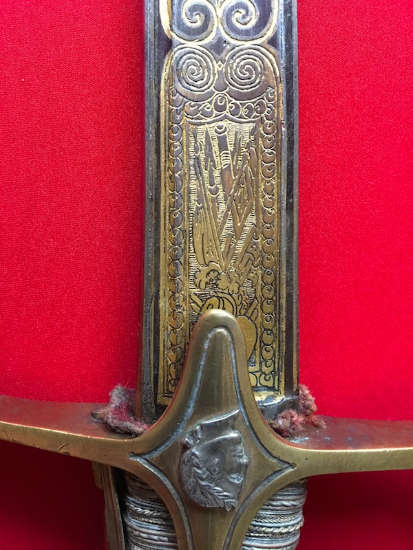 Слегка изогнутый клинок, позолота и синение. Кожаные ножны с латунными накладками.
