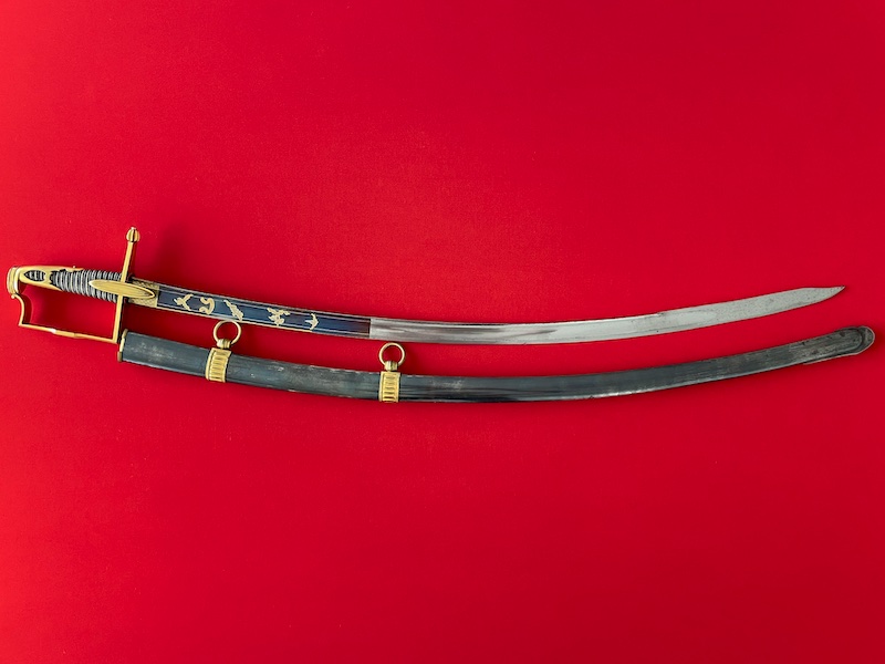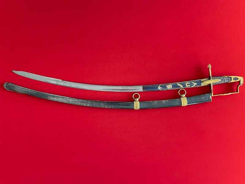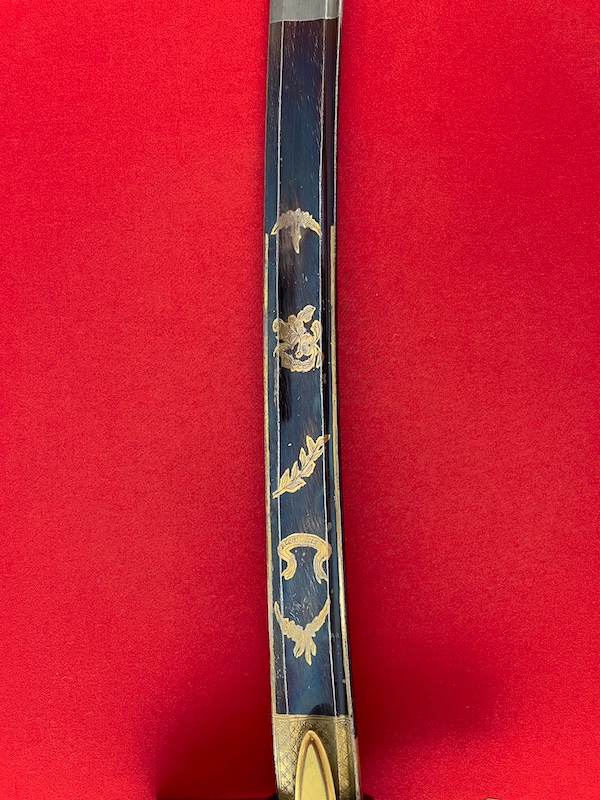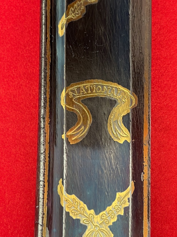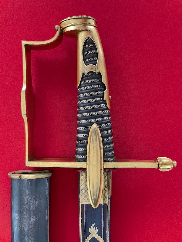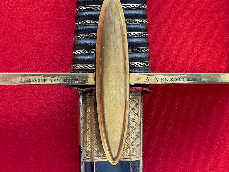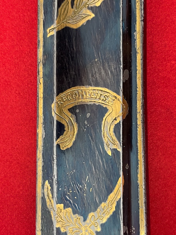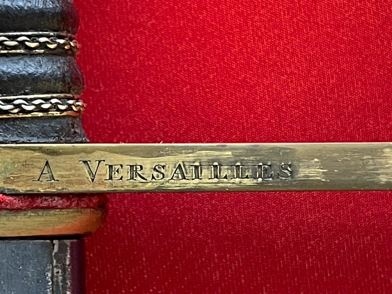 aus der Manufaktur Versailles - Nicolas Boutet. Vergoldete Parierstange, gebläute und vergoldete Klinge. Auf der einen Seite befindet sich die Beschriftung "Recompense", auf der anderen "Nationale". Stahlscheide mit gut erhaltener Originalbeschichtung, mit bläulicher Tönung.Auf der Parierstange ist "Manufacture A Versailles" eingraviert. Scheidenbeschläge mit gut erhaltener Vergoldung.