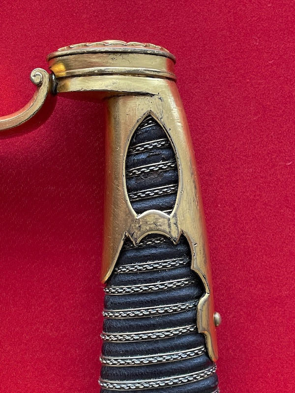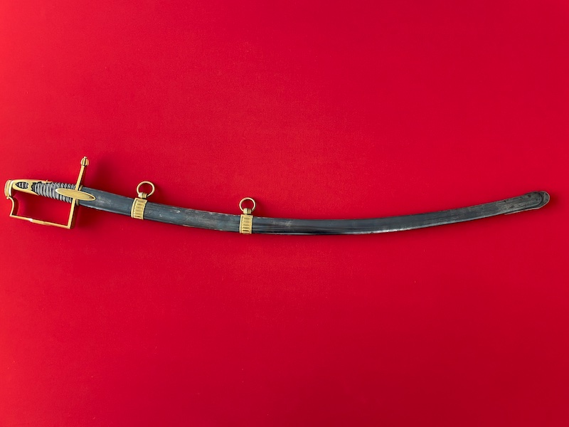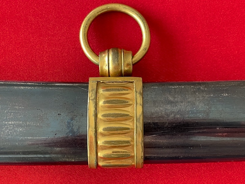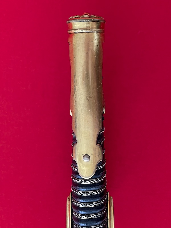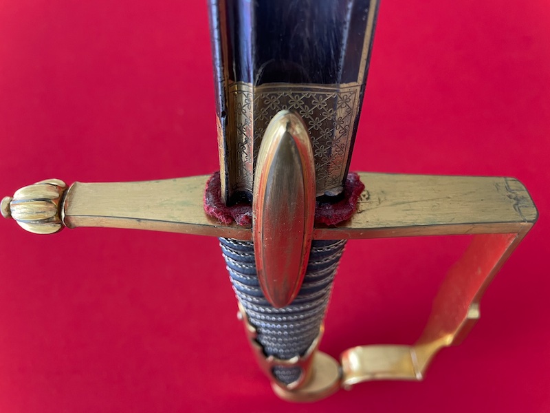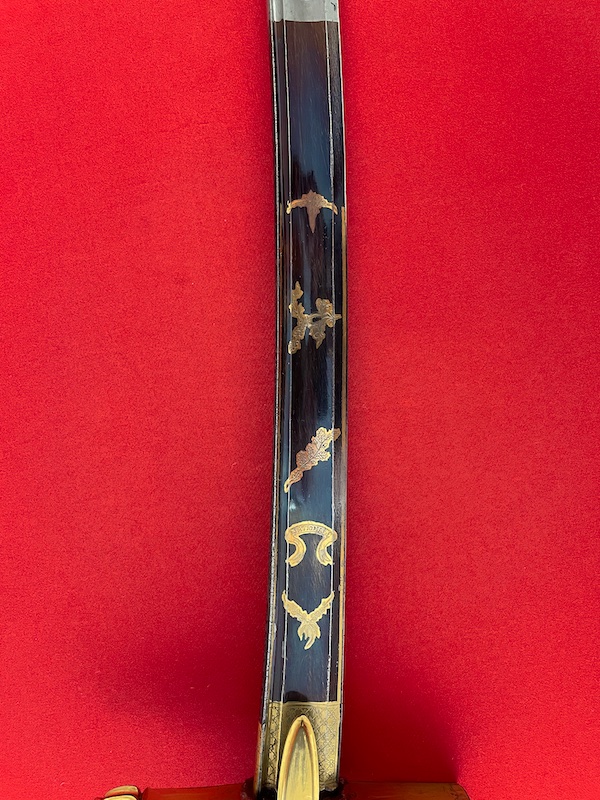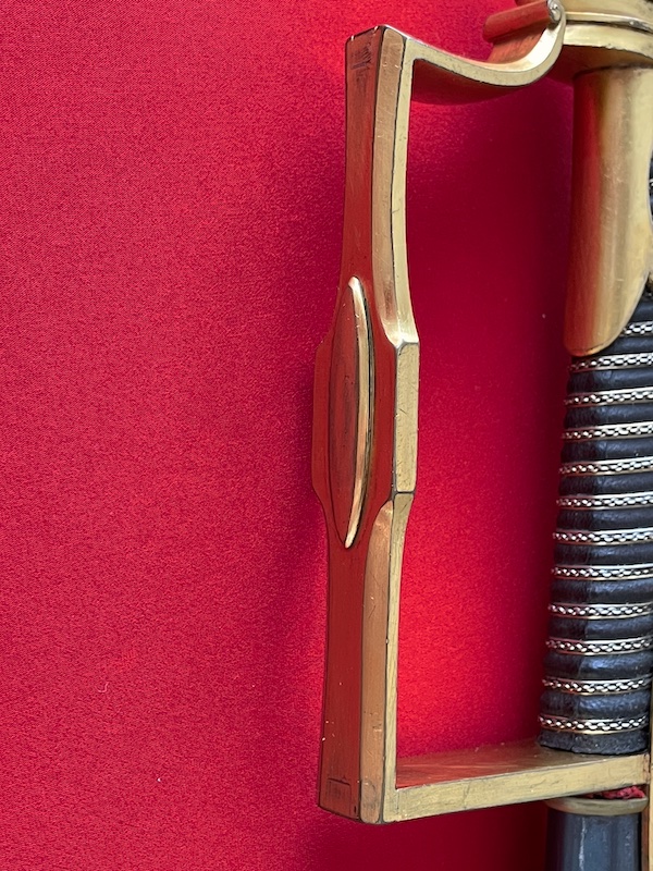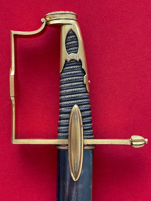 aus der Manufaktur Versailles - Nicolas Boutet. Vergoldete Parierstange, gebläute und vergoldete Klinge. Auf der einen Seite befindet sich die Beschriftung "Recompense", auf der anderen "Nationale". Stahlscheide mit gut erhaltener Originalbeschichtung, mit bläulicher Tönung.Auf der Parierstange ist "Manufacture A Versailles" eingraviert. Scheidenbeschläge mit gut erhaltener Vergoldung.
