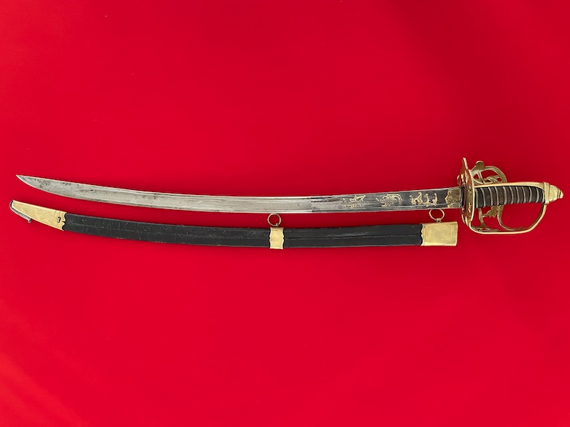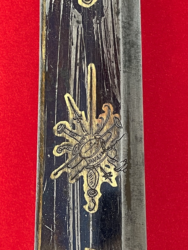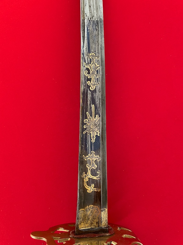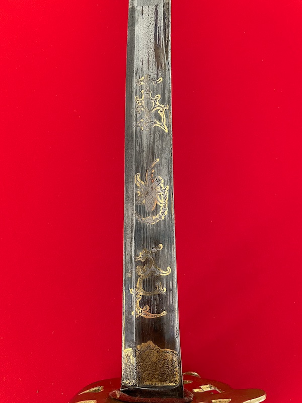 Messinggefäß mit Restvergoldung. Leicht geschwungene Rückenklinge.