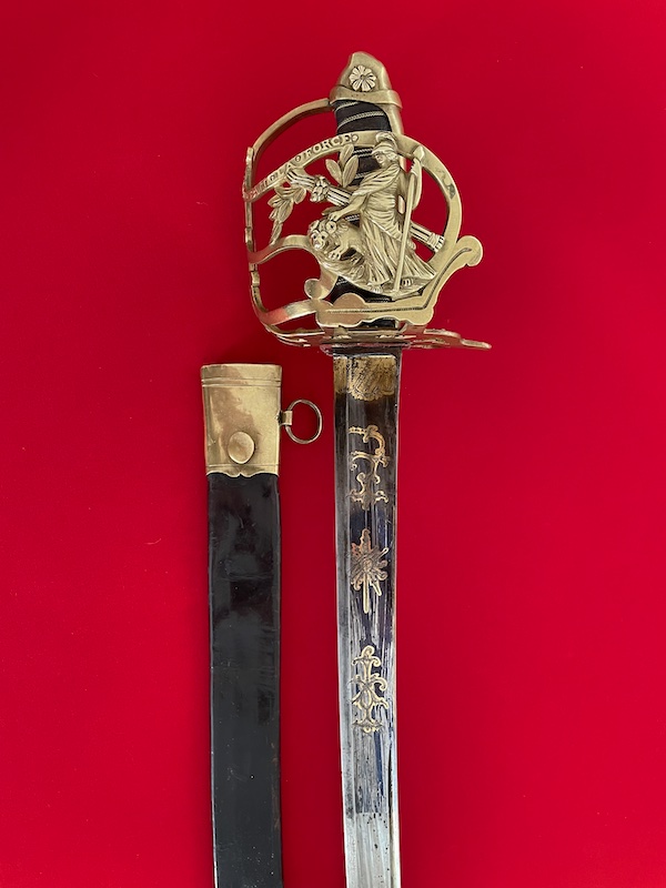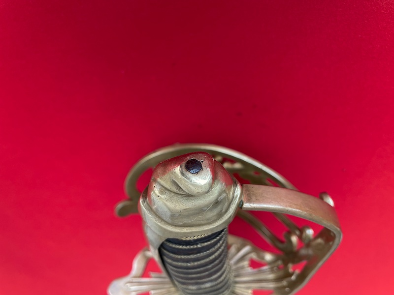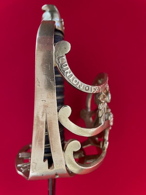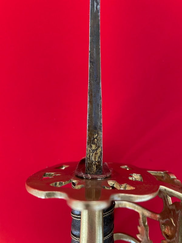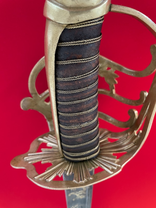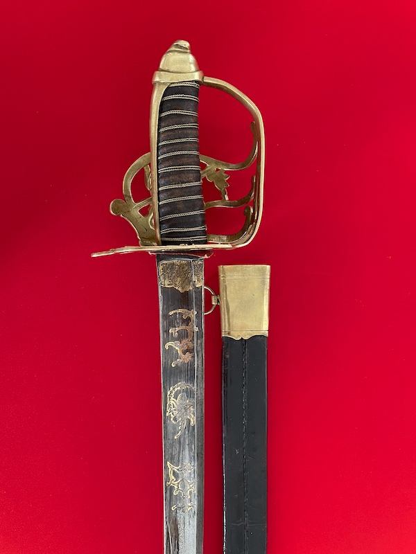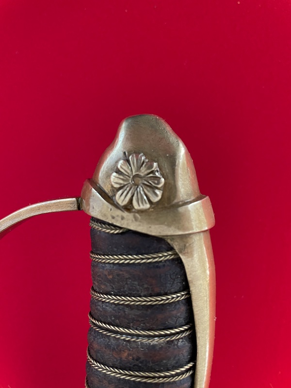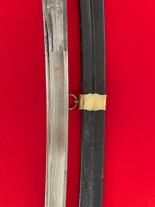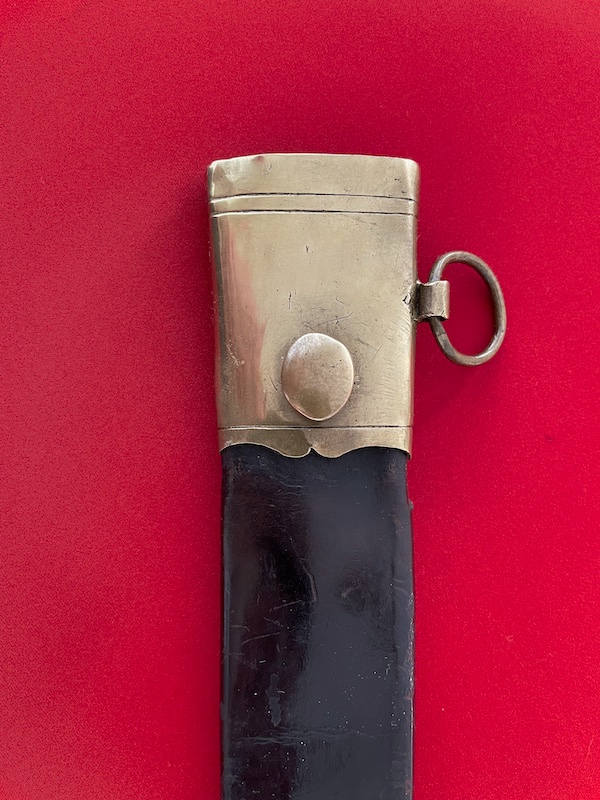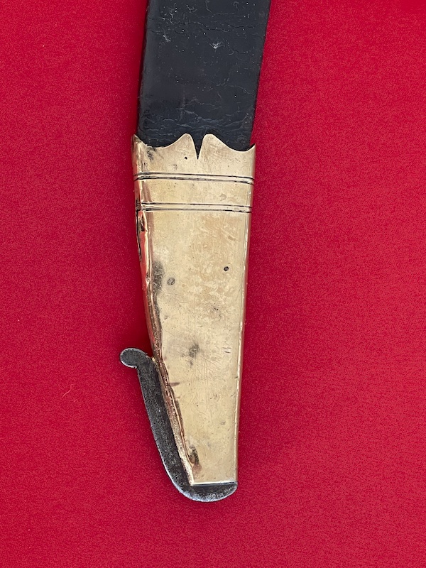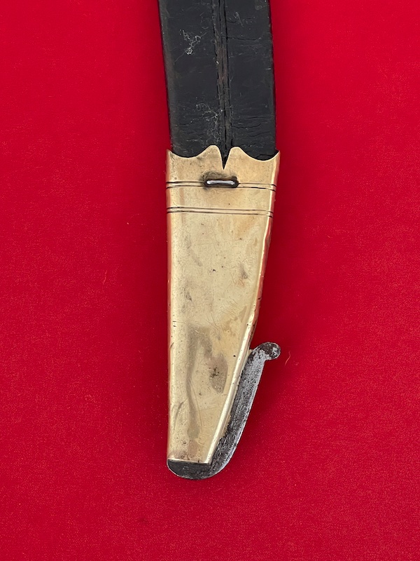 Belederte Hilze mit Messingdrahtwicklung. Lederscheide mit Messingbeschlägen.