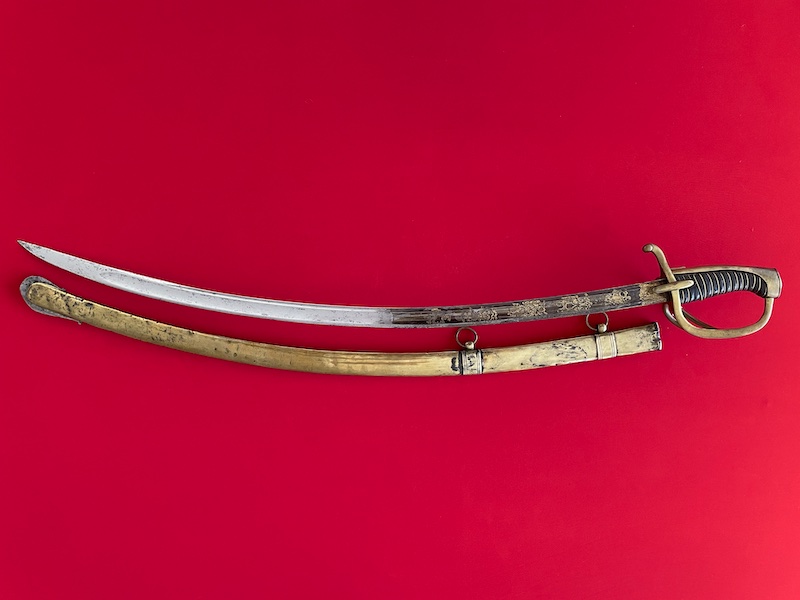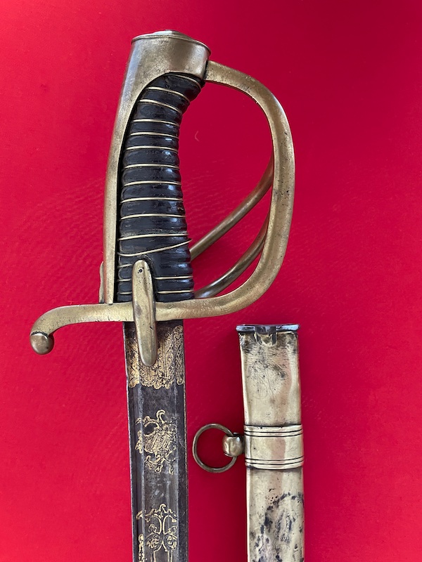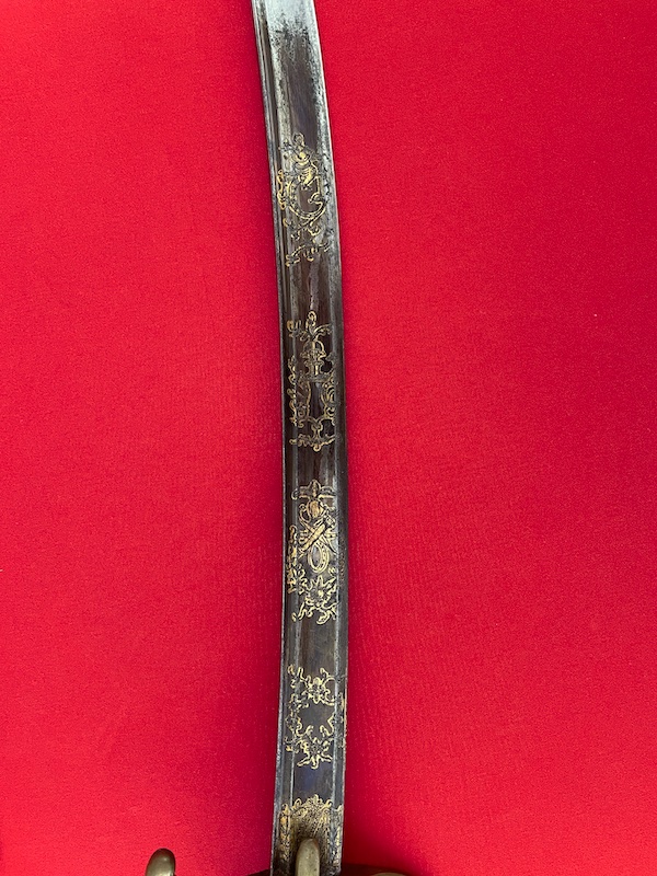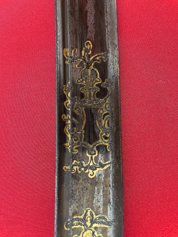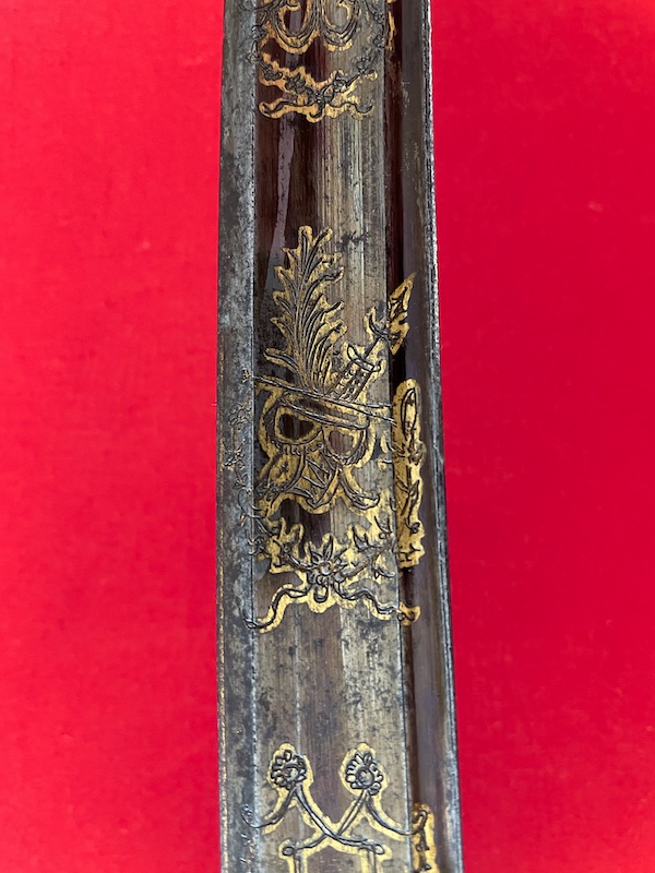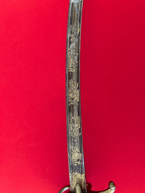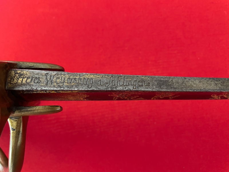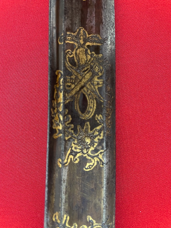 Messinggefäß, sehr schöne Klinge (Solingen), geätzt, gebläut und vergoldet.