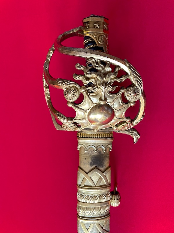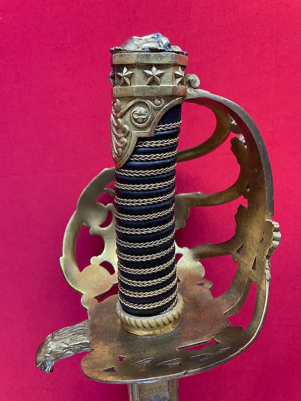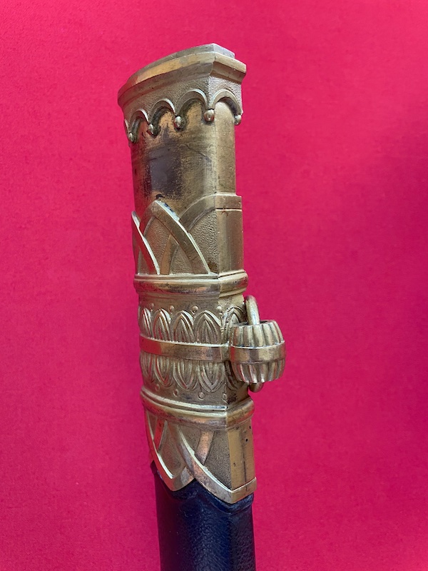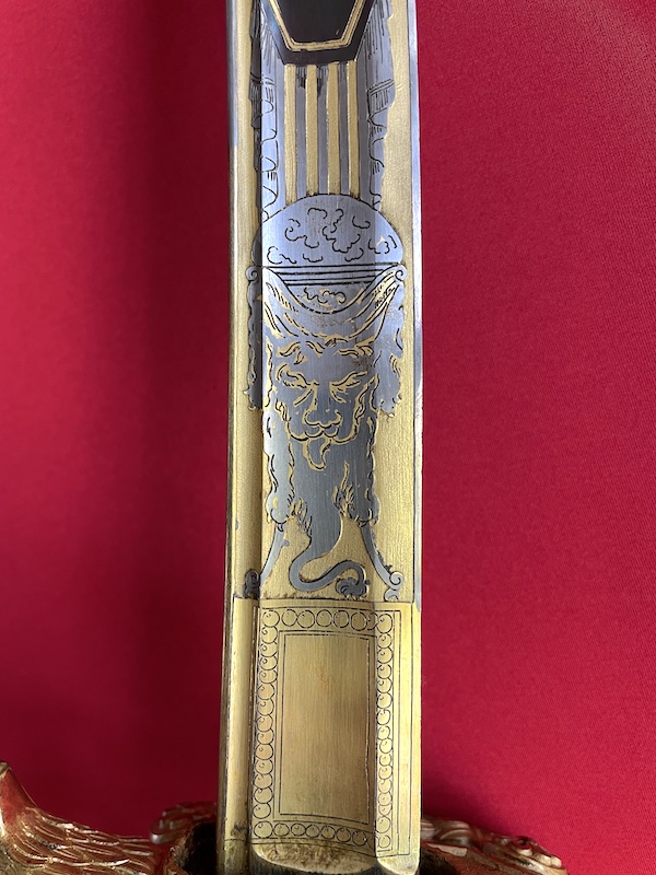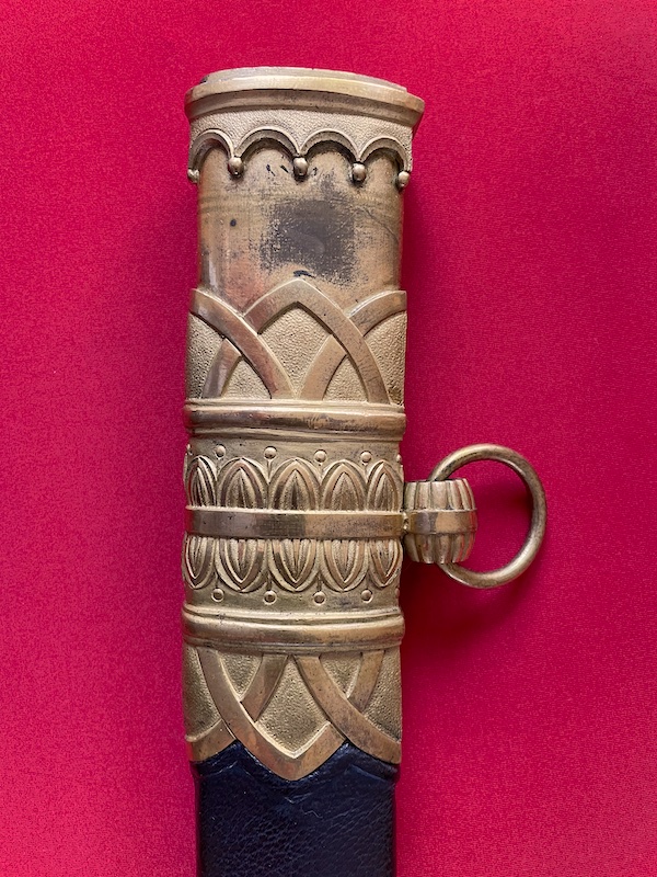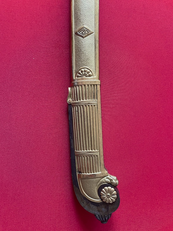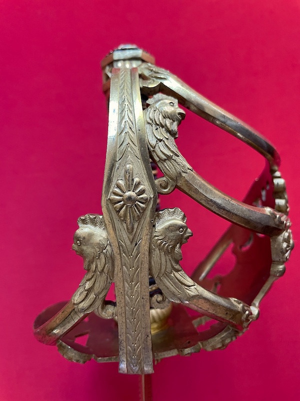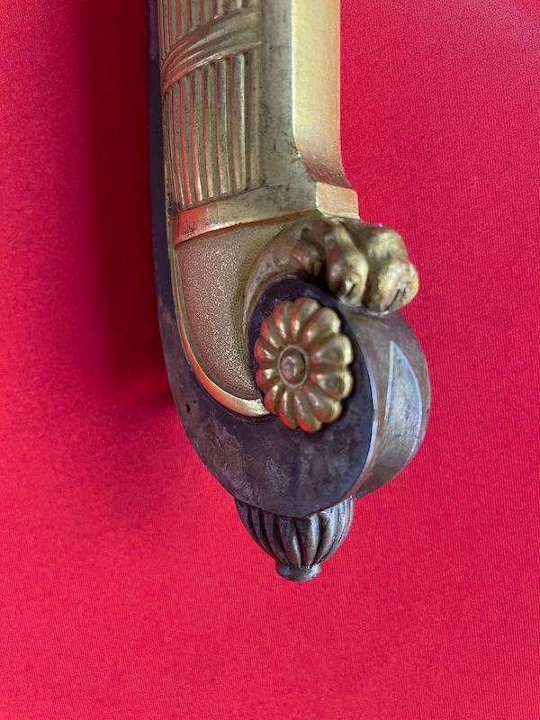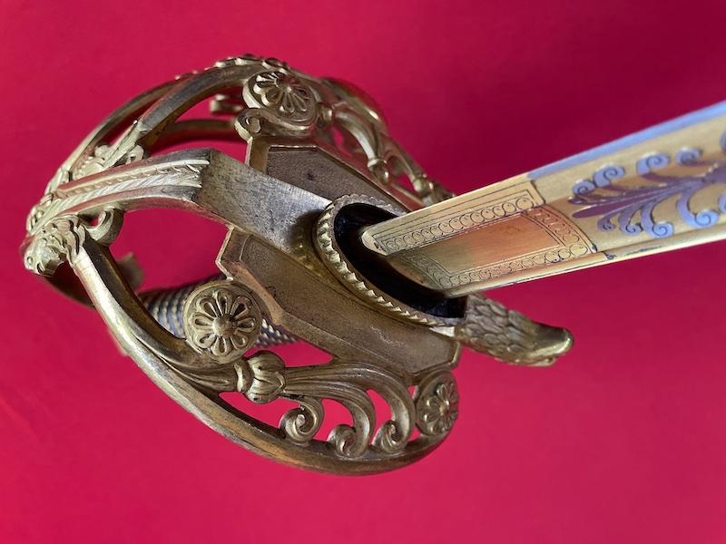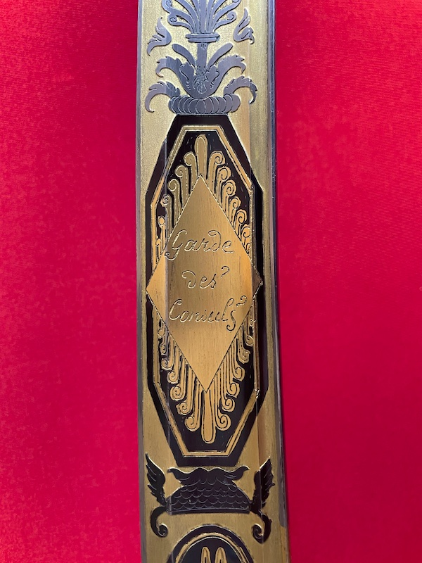 DER OFFIZIER GRENADIERE ZU PFERD DER KONSULNGARDE. Holzgriff mit Lederüberzug und Filigranmuster. Reich verzierte, gravierte, ziselierte und vergoldete Messingfassung. Kalotte mit kurzem, reliefiert ziseliertem Schwanz, auf dem ein Löwenkopf sitzt. Dieses wird von einem achtseitigen Ring mit sieben Sternen umgürtet, die Röcke sind mit Blümchen und einer Palme verziert. Fünfarmiger Muschelgriff aus Messing mit einem Spinnennetz in der Mitte, mit einer platzenden Granate. Die vier vom Hauptarm ausgehenden Äste sind mit Hahnenköpfen. Diese sind verziert und enden in Blattrosetten. Quillon mit Adlerkopf, der Schnabel zeigt zur Spitze hin. Gekrümmte Klinge mit rundem Rücken, geätzt "Manufacture de Klingenthal Coulaux frères", mit Gegenschneide und Hohlkehle, zu einem Drittel mit Attributen und Waffentrophäen geätzt. Mit Leder überzogene Holzscheide, mit drei Messingbeschlägen, ziseliert, vergoldet. Der Dart ist aus Eisen.