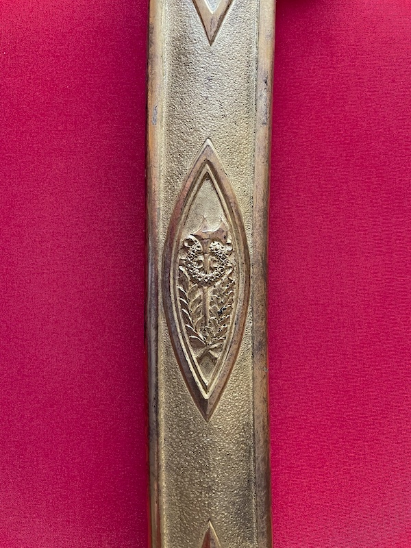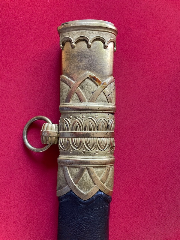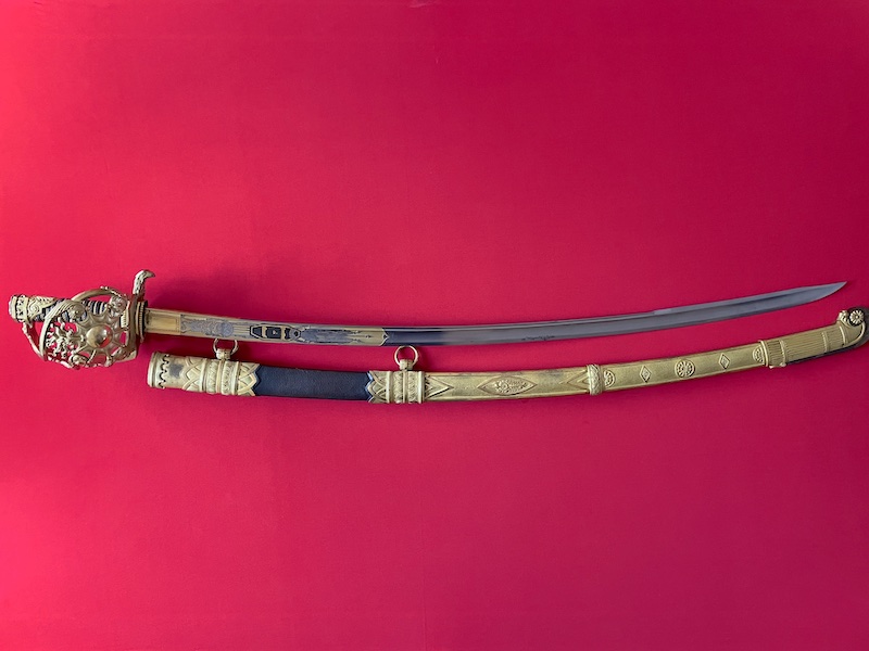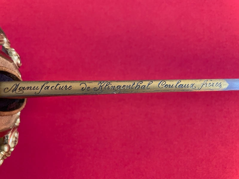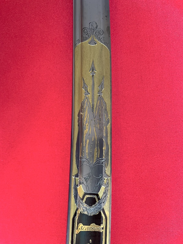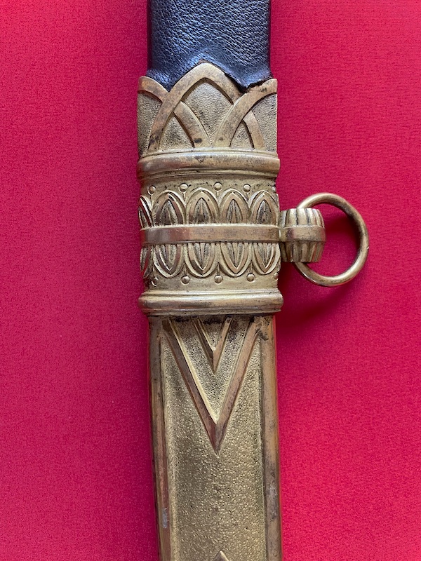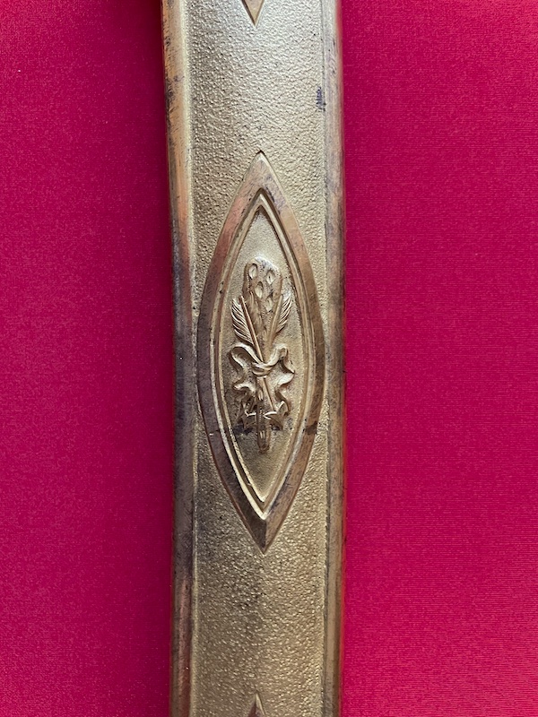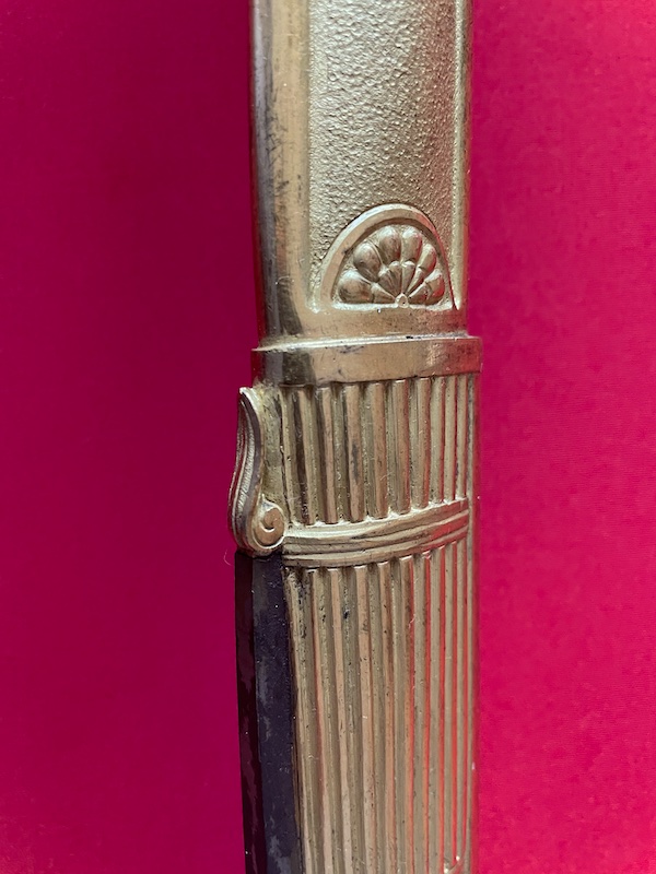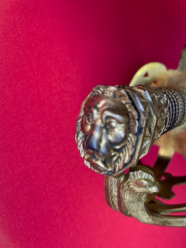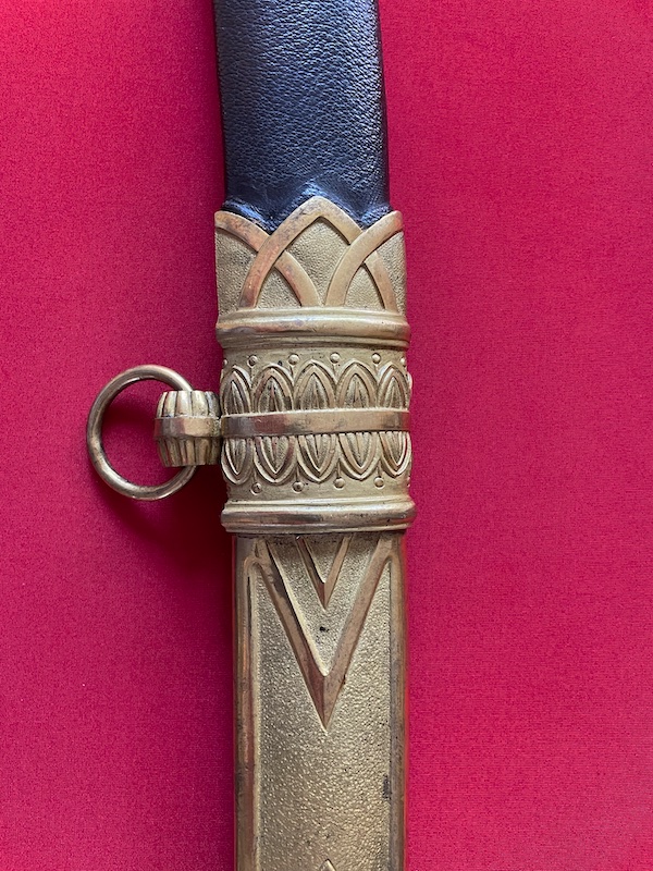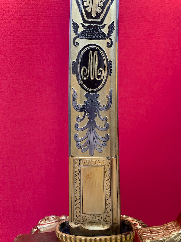 DER OFFIZIER GRENADIERE ZU PFERD DER KONSULNGARDE. Holzgriff mit Lederüberzug und Filigranmuster. Reich verzierte, gravierte, ziselierte und vergoldete Messingfassung. Kalotte mit kurzem, reliefiert ziseliertem Schwanz, auf dem ein Löwenkopf sitzt. Dieses wird von einem achtseitigen Ring mit sieben Sternen umgürtet, die Röcke sind mit Blümchen und einer Palme verziert. Fünfarmiger Muschelgriff aus Messing mit einem Spinnennetz in der Mitte, mit einer platzenden Granate. Die vier vom Hauptarm ausgehenden Äste sind mit Hahnenköpfen. Diese sind verziert und enden in Blattrosetten. Quillon mit Adlerkopf, der Schnabel zeigt zur Spitze hin. Gekrümmte Klinge mit rundem Rücken, geätzt "Manufacture de Klingenthal Coulaux frères", mit Gegenschneide und Hohlkehle, zu einem Drittel mit Attributen und Waffentrophäen geätzt. Mit Leder überzogene Holzscheide, mit drei Messingbeschlägen, ziseliert, vergoldet. Der Dart ist aus Eisen.