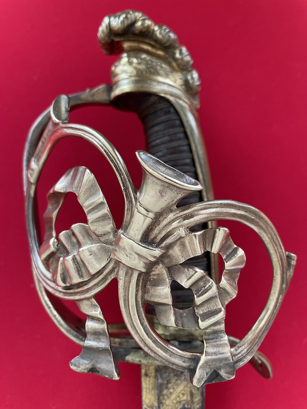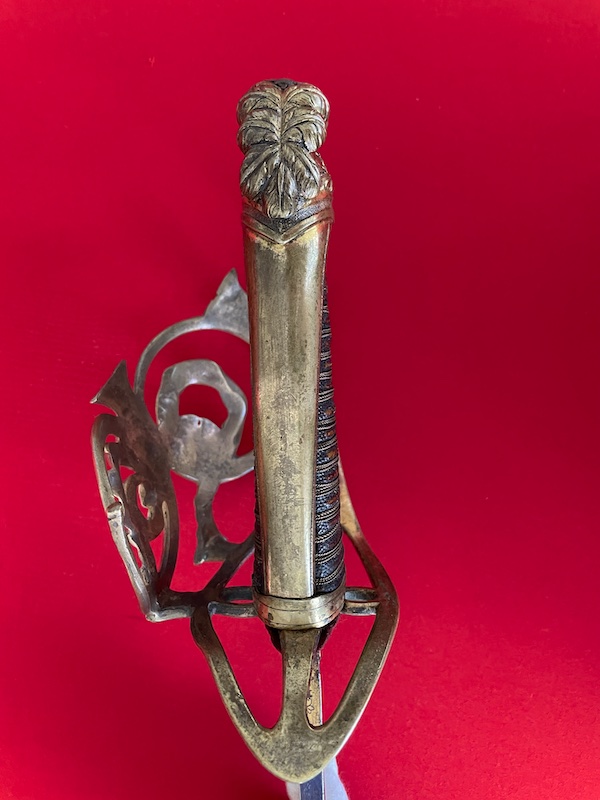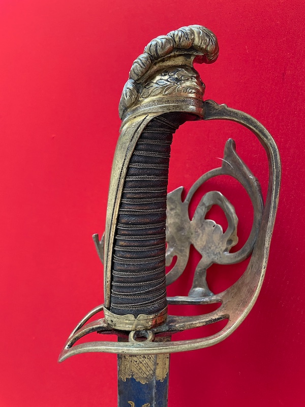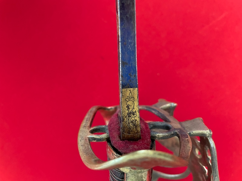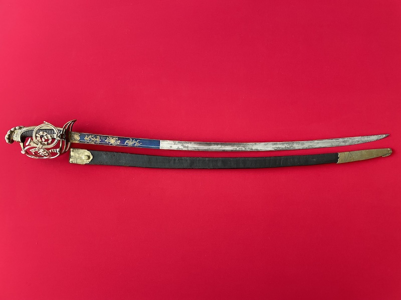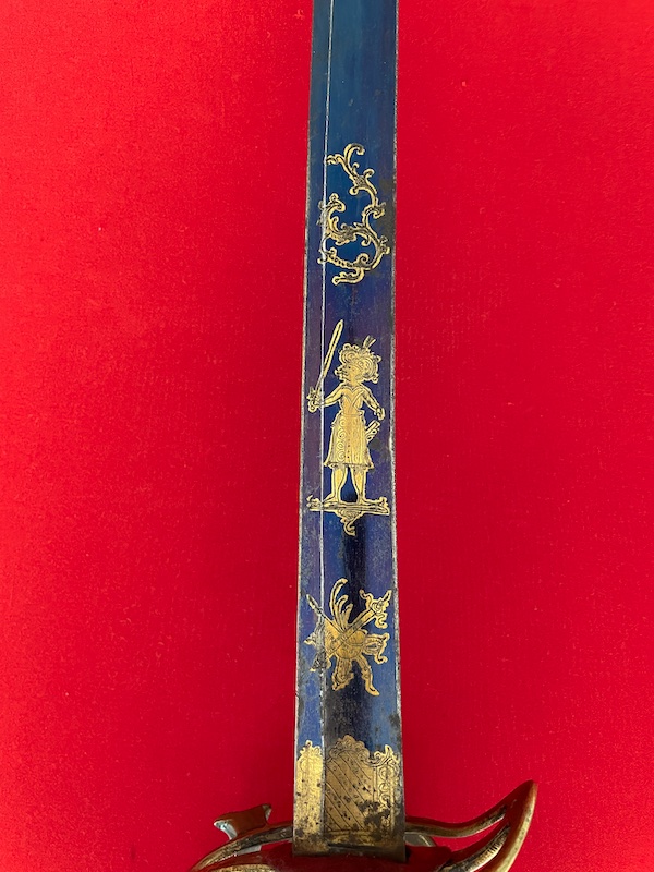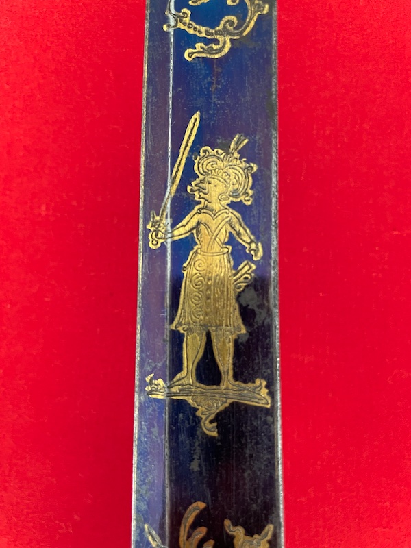 Messinggefäß m. Restvergoldung. Leicht geschwungene Rückenklinge gebläut und geätzt.