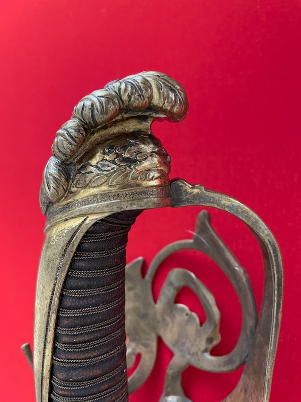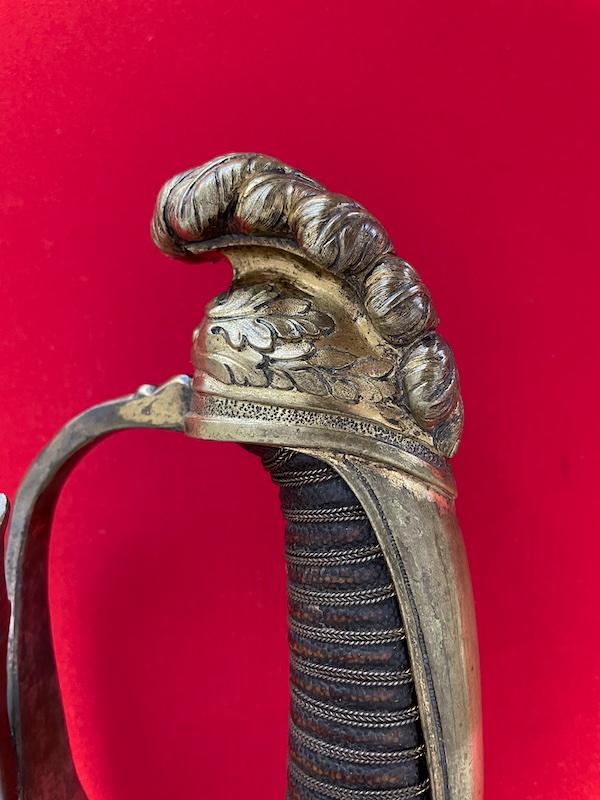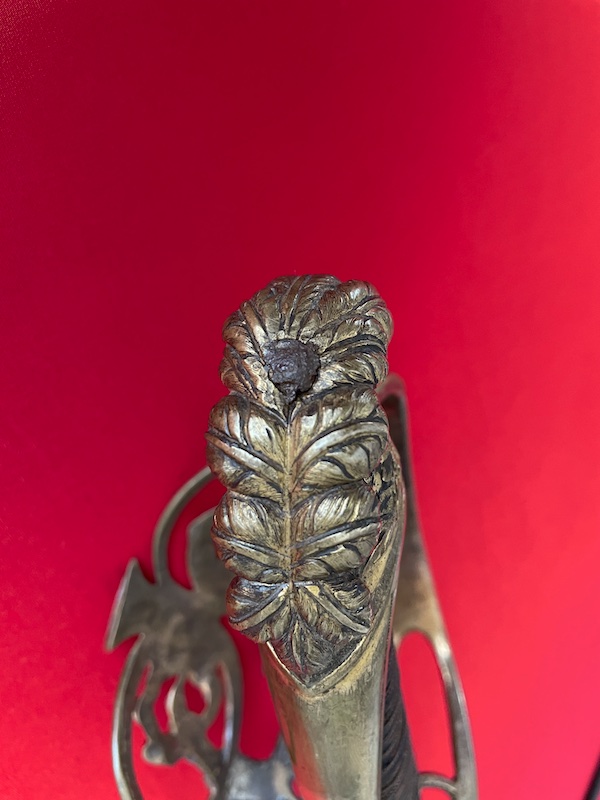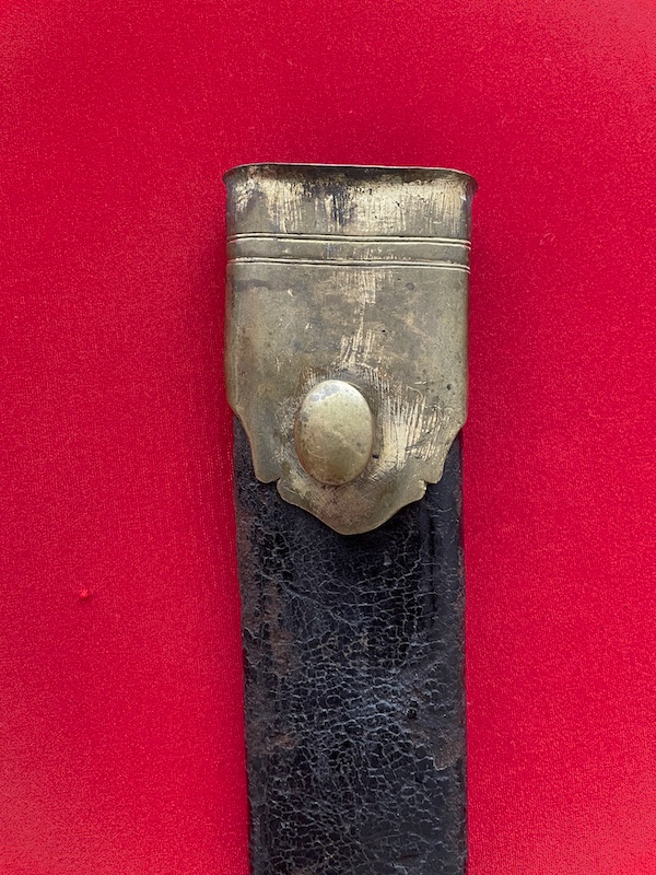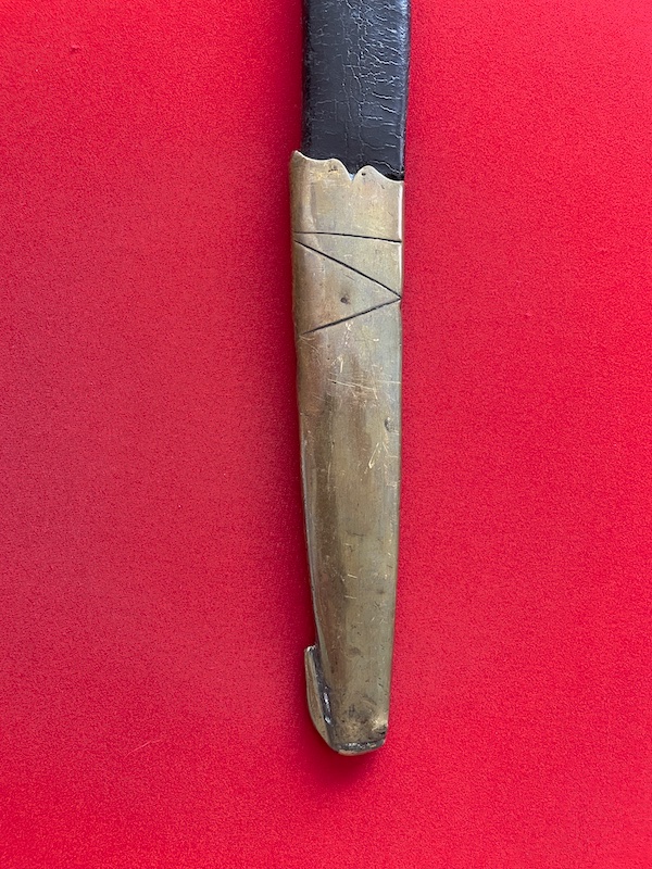 Belederte Hilze mit Messingdrahtwicklung. Lederscheide mit Messingbeschlägen.