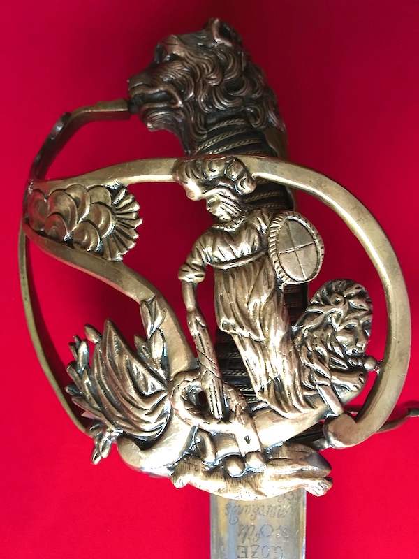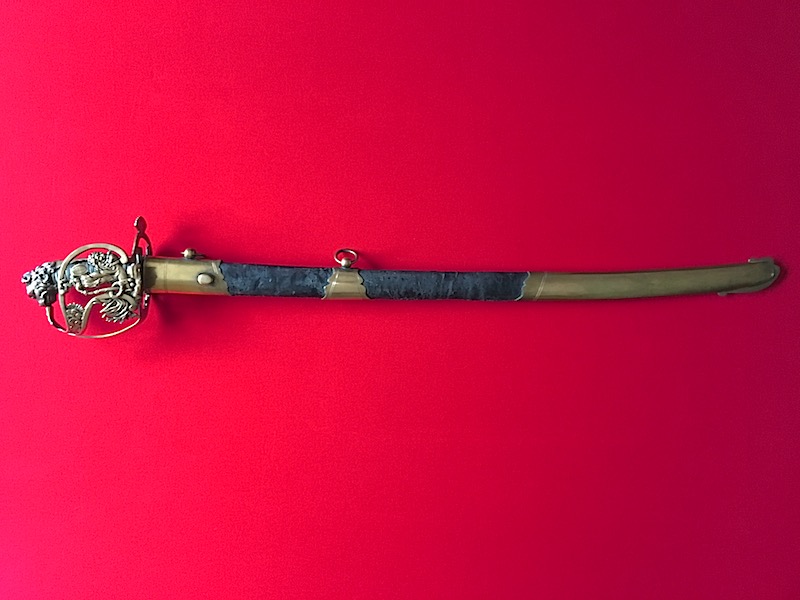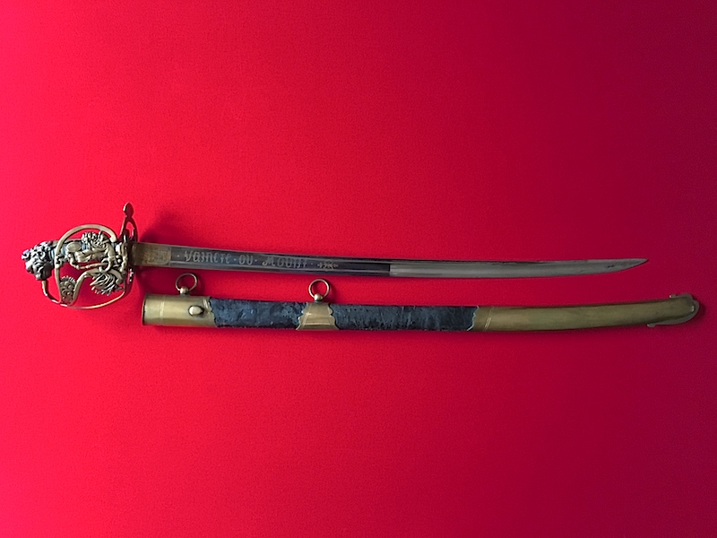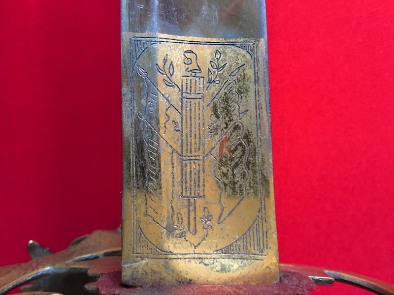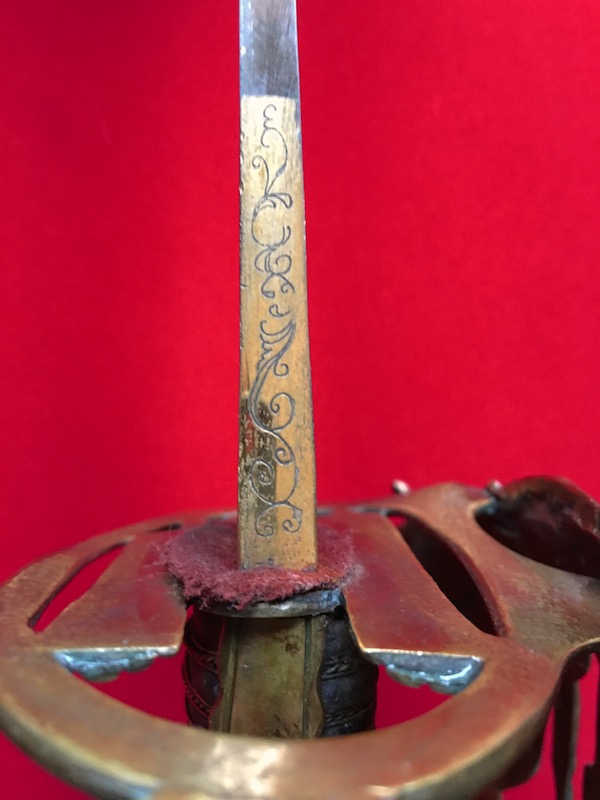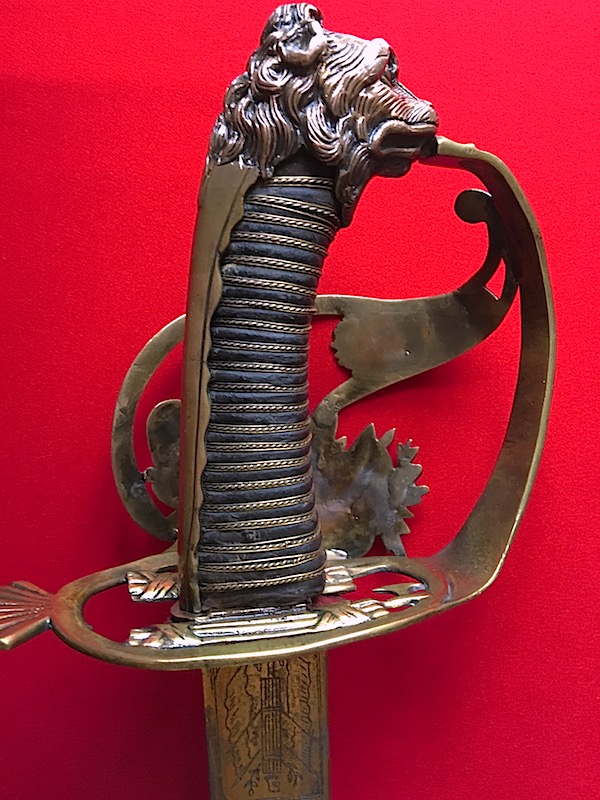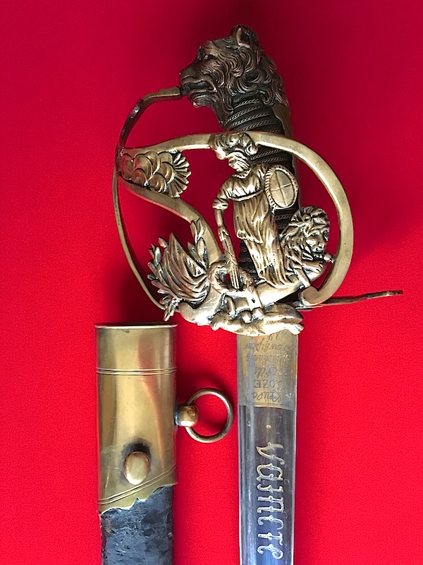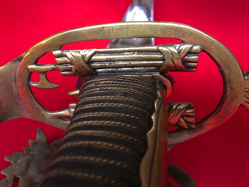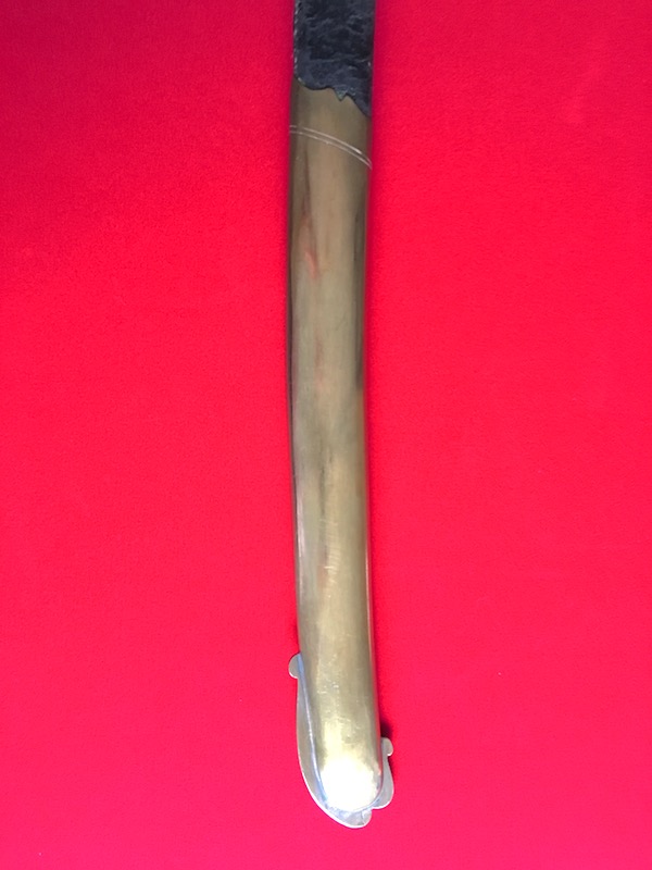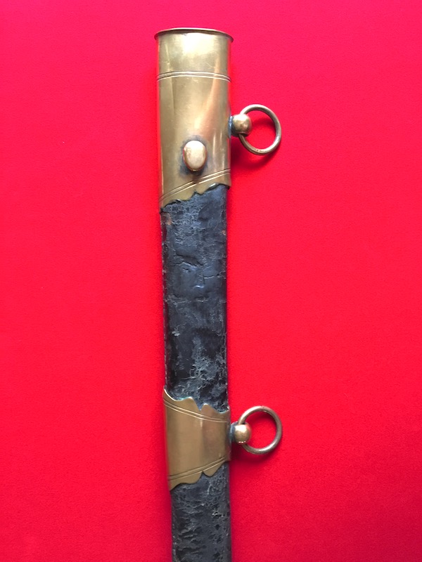 Belederte Hilze mit Messingdrahtwicklung. Lederscheide mit vergoldeten Messingbeschlägen.
