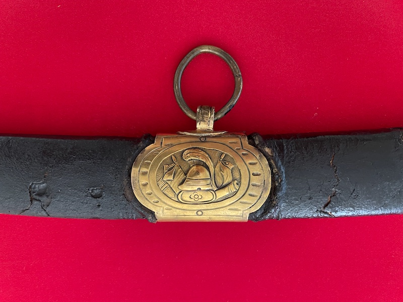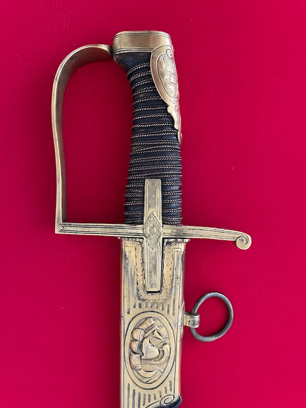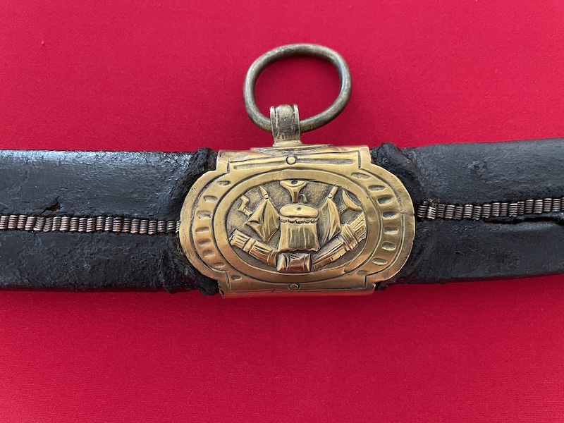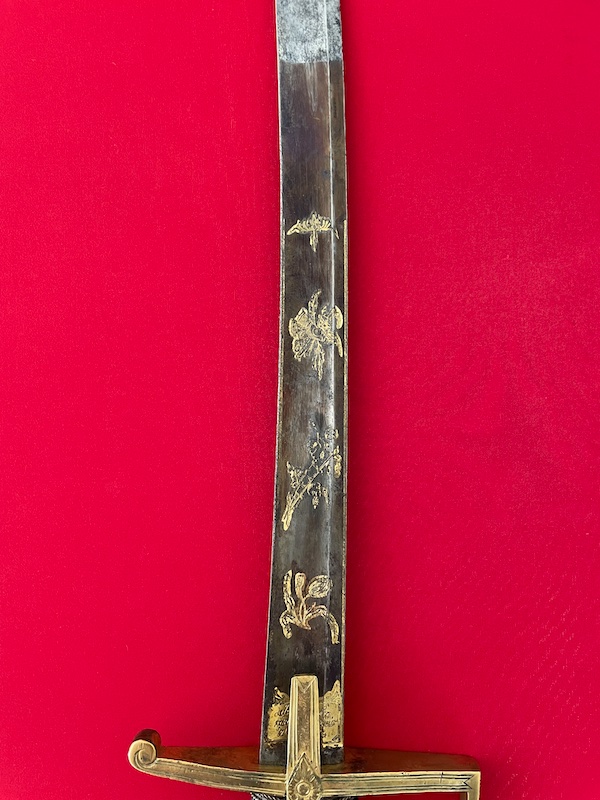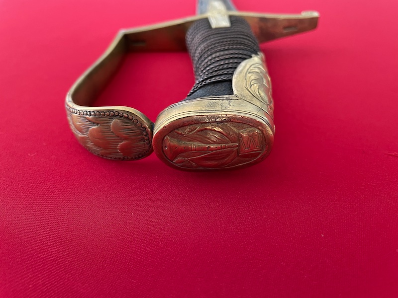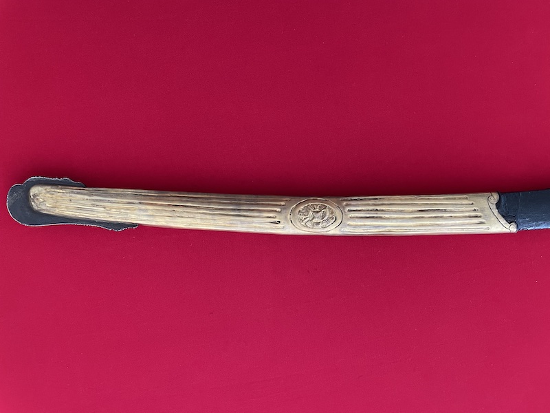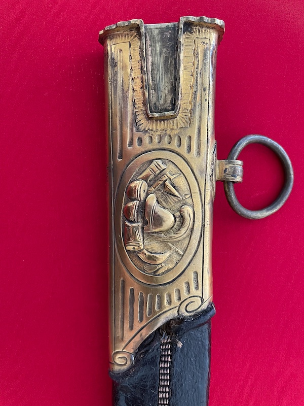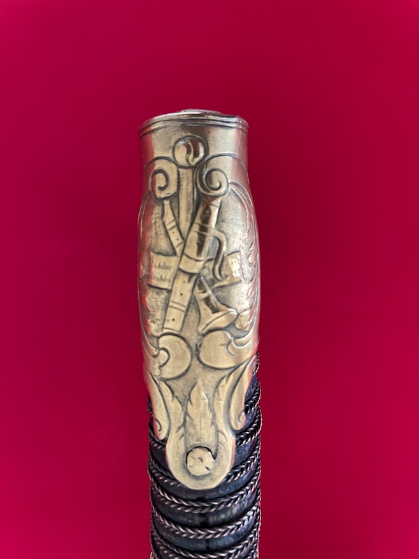 Leicht gekrümmte Klinge, geätzt, gebläut und vergoldet. Belederte Hilze mit Drahtwicklung. Lederscheide mit Messingbeschlägen. Punziert "BRUN".