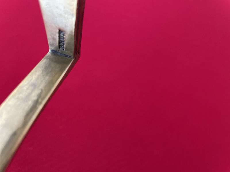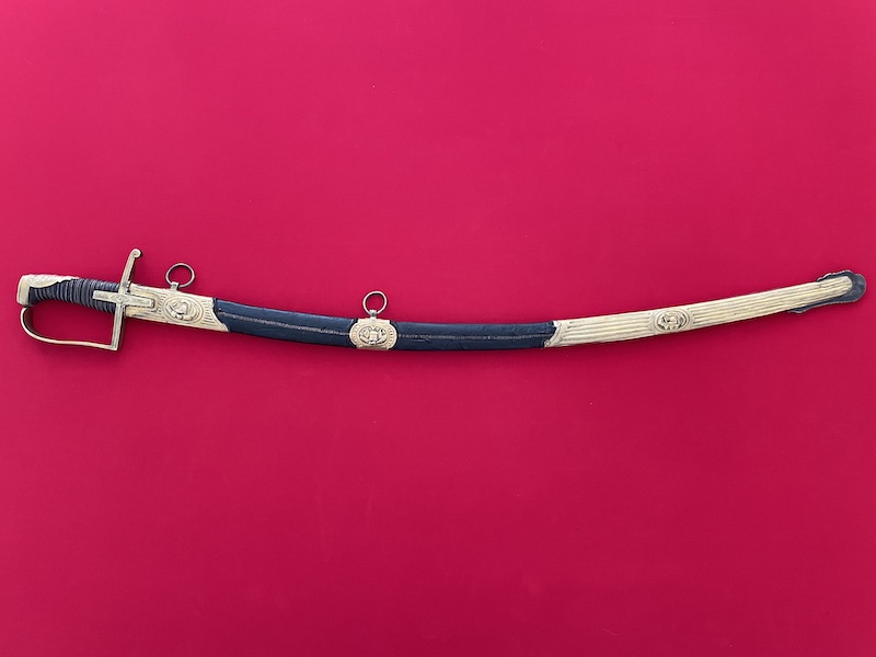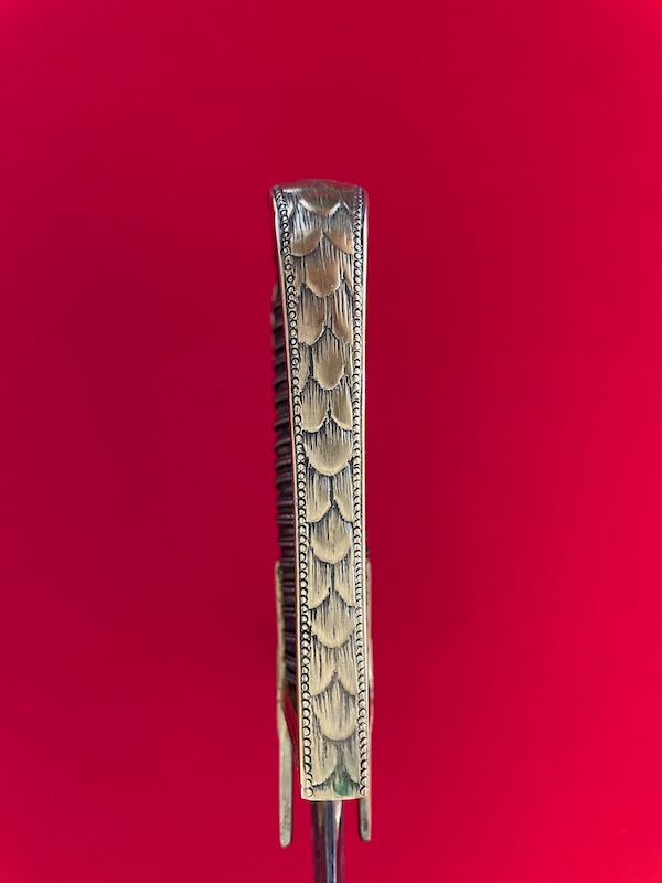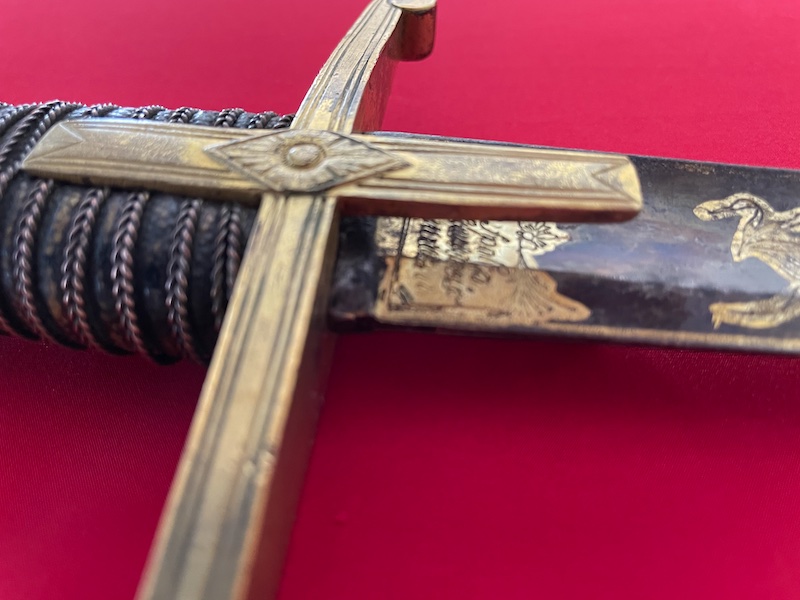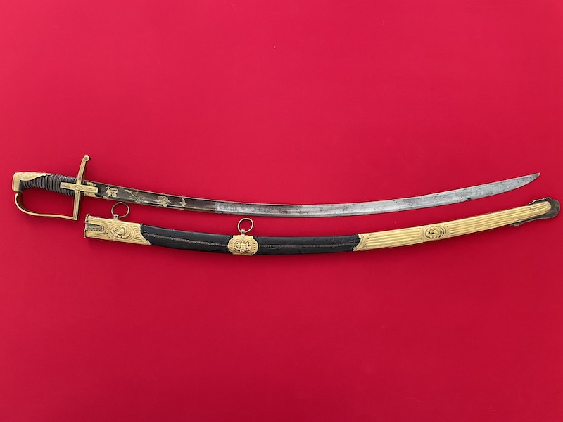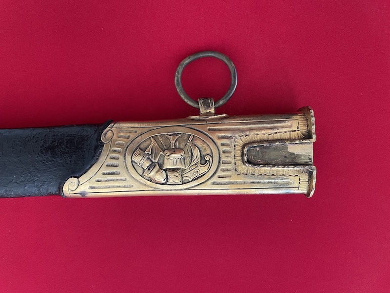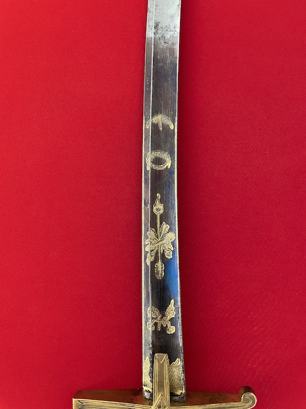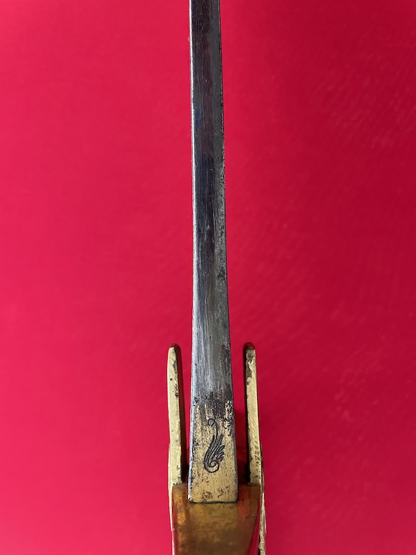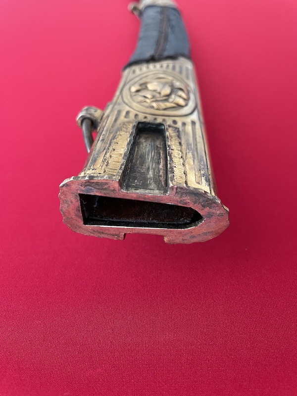 Leicht gekrümmte Klinge, geätzt, gebläut und vergoldet. Belederte Hilze mit Drahtwicklung. Lederscheide mit Messingbeschlägen. Punziert "BRUN".