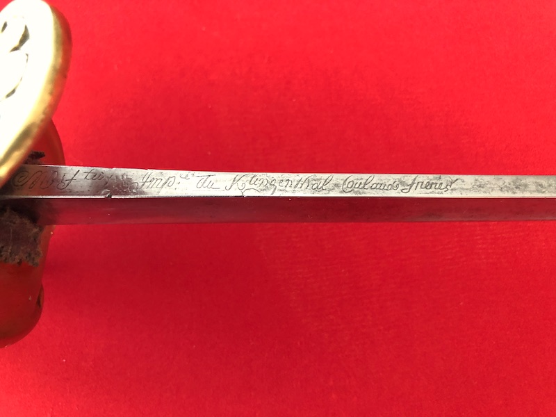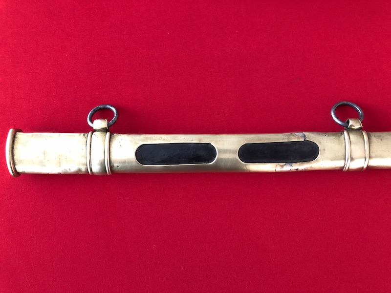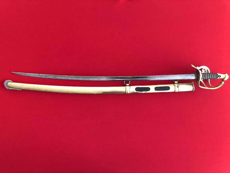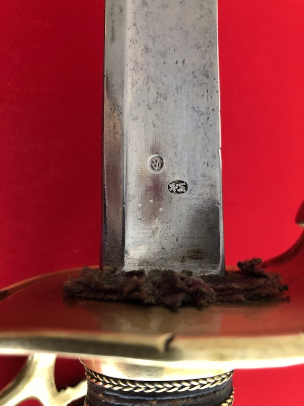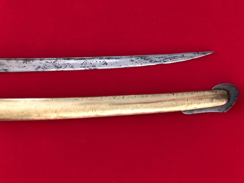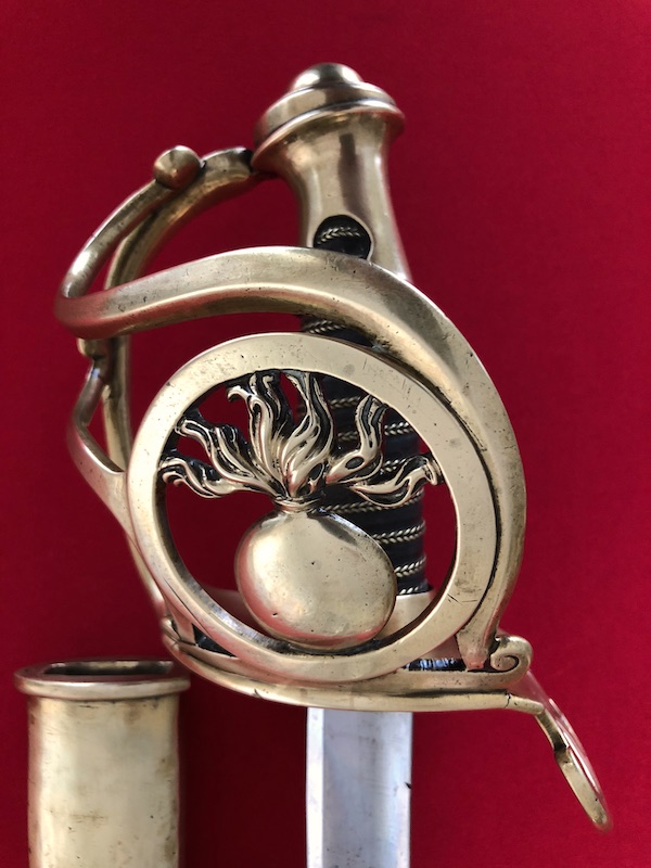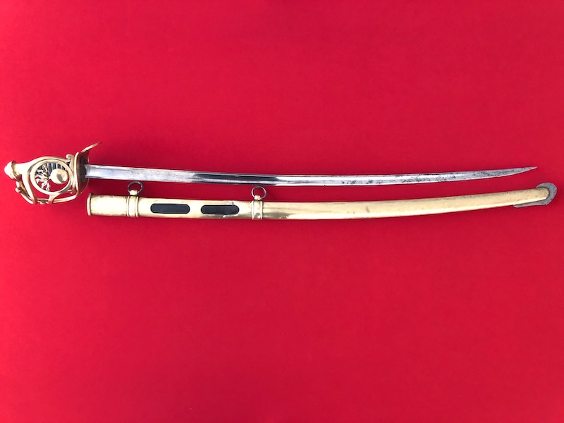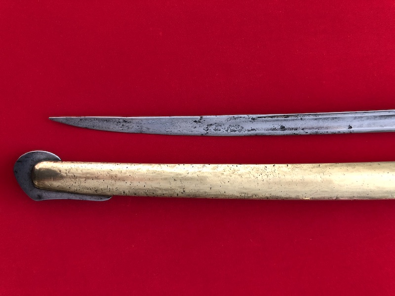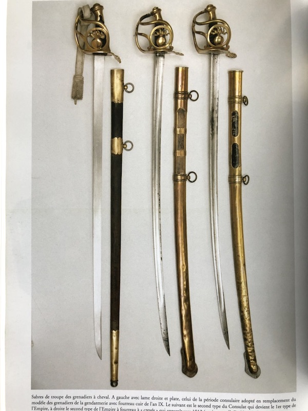 der Grenadiers à Cheval de la Garde des Consuls puis Impériale, 2. Modell. Messingkorb mit 2 Terzspangen und rundem Köchelschild mit offener platzender Granate, breites Stichblatt mit Palmette, Marke „Versailles" und div. Punzen. Originales Griffleder mit Wicklung. Polierte Montmerencyklinge mit Gravur von Klingenthal und Marken des Inspecteurs C. Marion (1810-1811) und J.G. Bick (1809-1811), zum Ort hin stärker narbig. Schwere Messingscheide mit 2 Trageringen an breiten Bändern und Ledereinsätzen, eiserner Schlepper. L= 116,5 cm.
