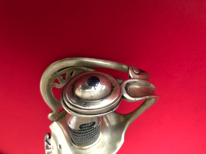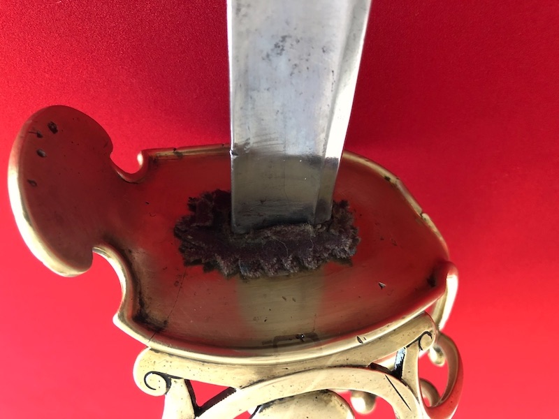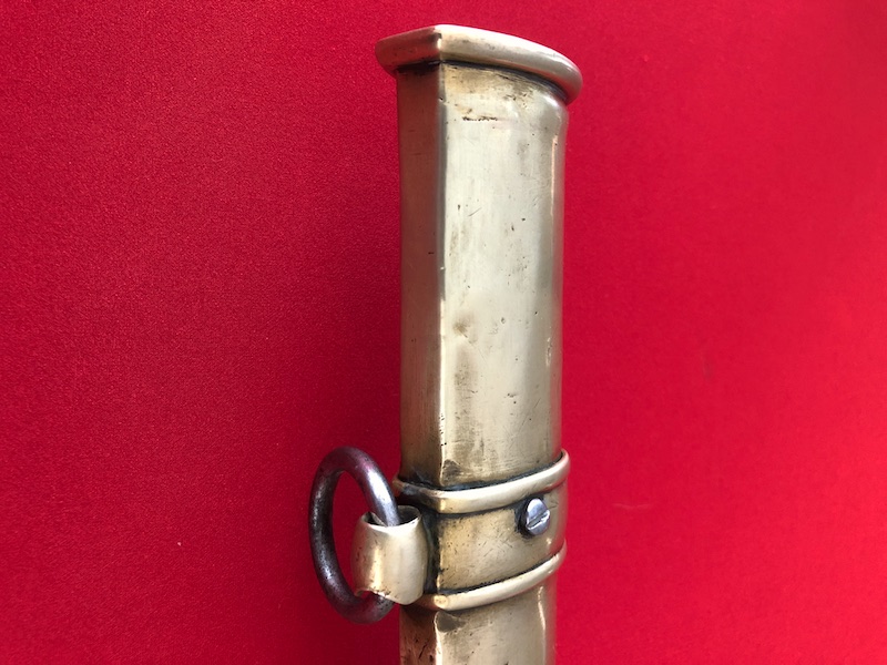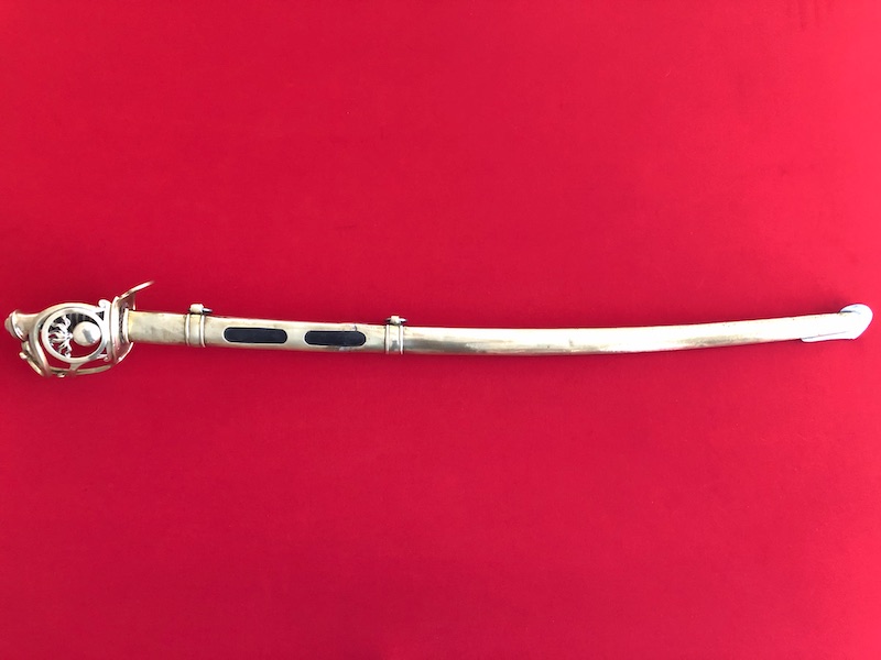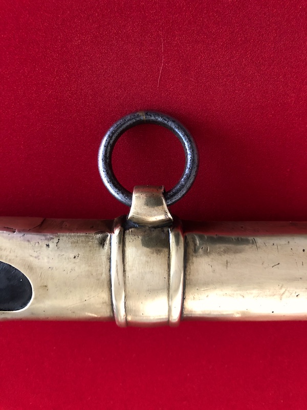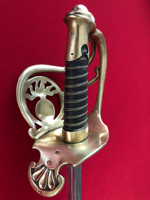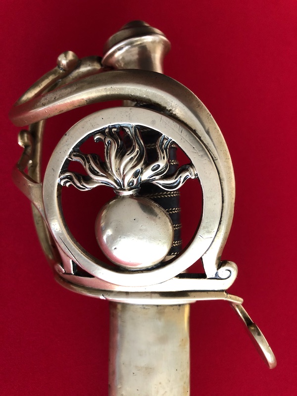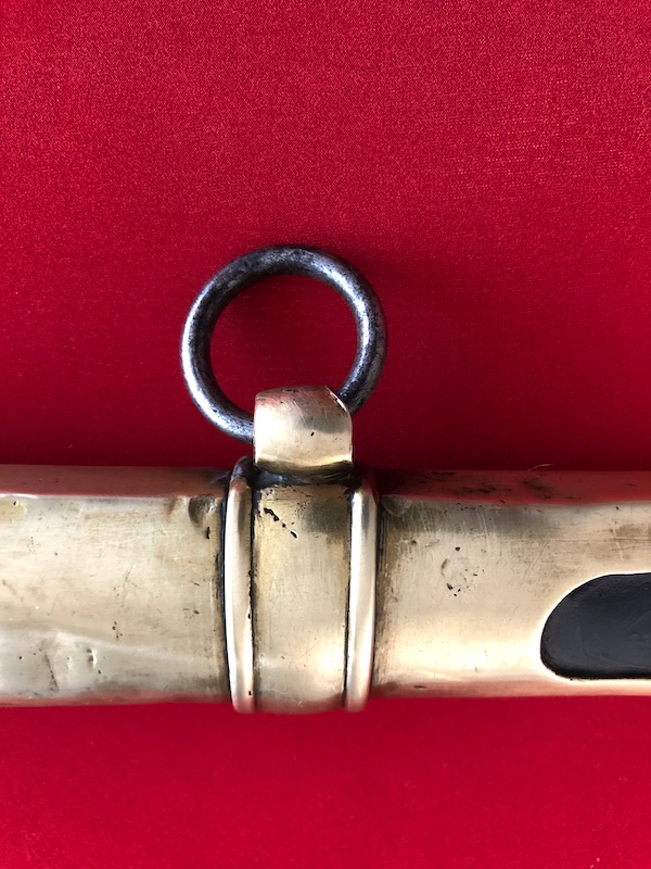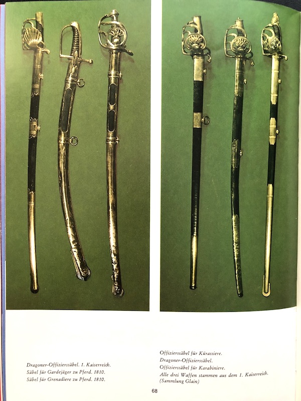 der Grenadiers à Cheval de la Garde des Consuls puis Impériale, 2. Modell. Messingkorb mit 2 Terzspangen und rundem Köchelschild mit offener platzender Granate, breites Stichblatt mit Palmette, Marke „Versailles" und div. Punzen. Originales Griffleder mit Wicklung. Polierte Montmerencyklinge mit Gravur von Klingenthal und Marken des Inspecteurs C. Marion (1810-1811) und J.G. Bick (1809-1811), zum Ort hin stärker narbig. Schwere Messingscheide mit 2 Trageringen an breiten Bändern und Ledereinsätzen, eiserner Schlepper. L= 116,5 cm.
