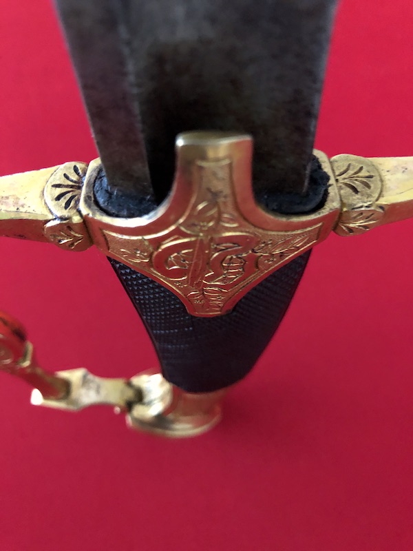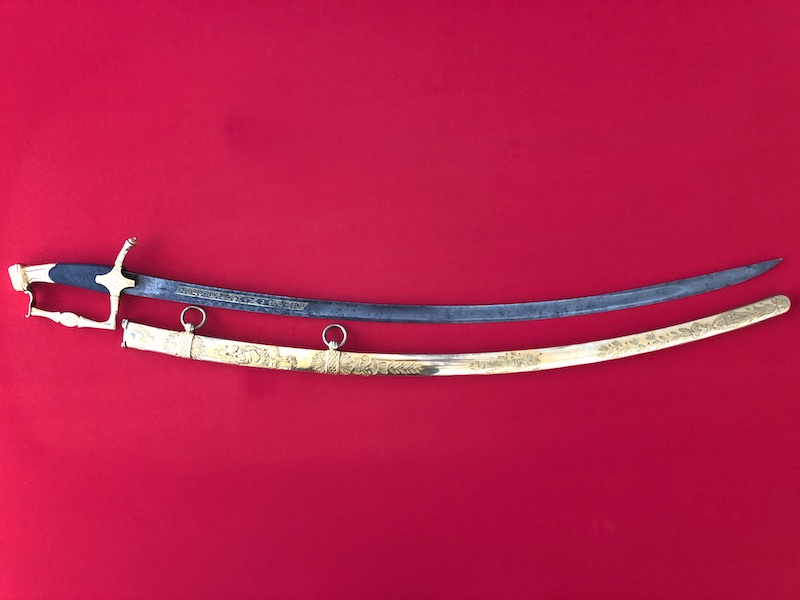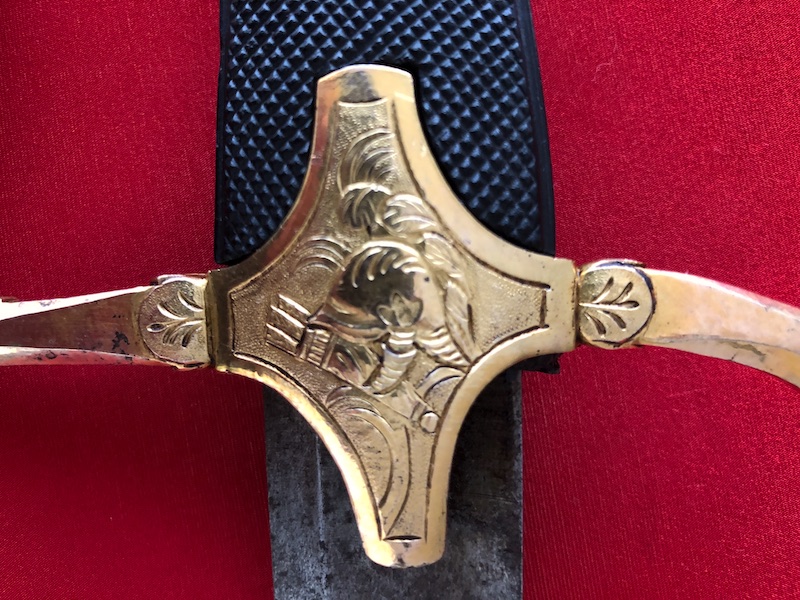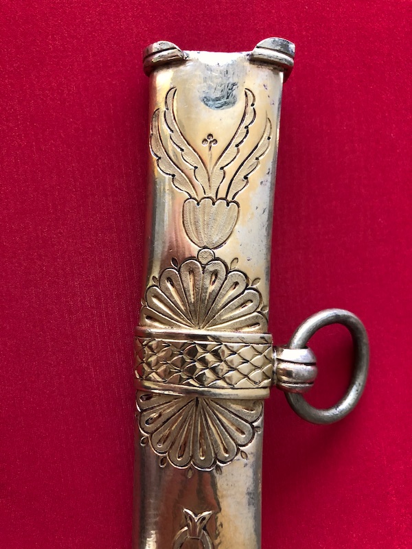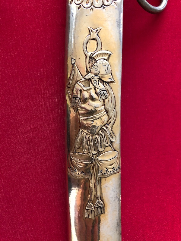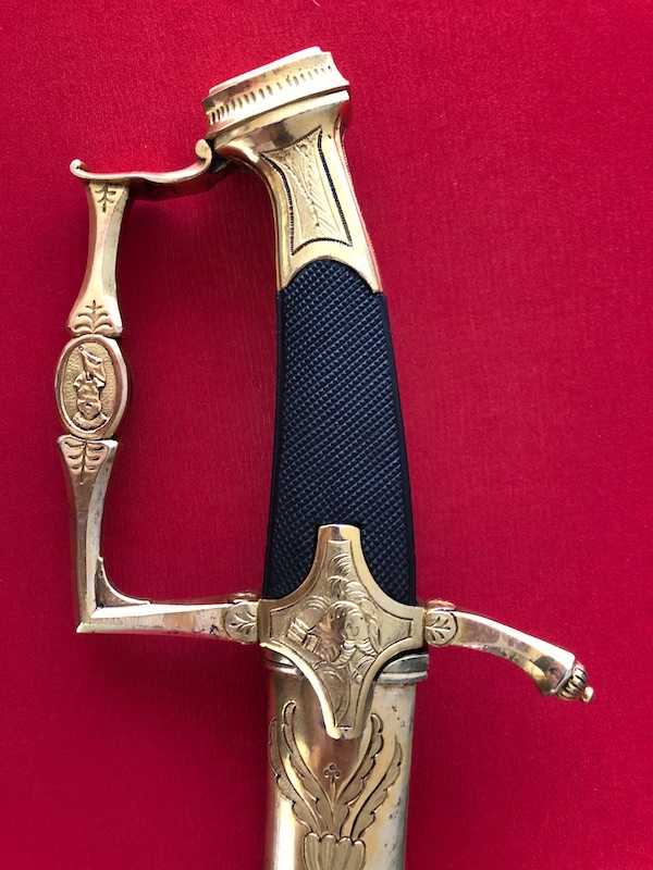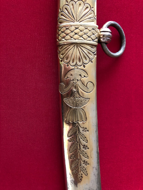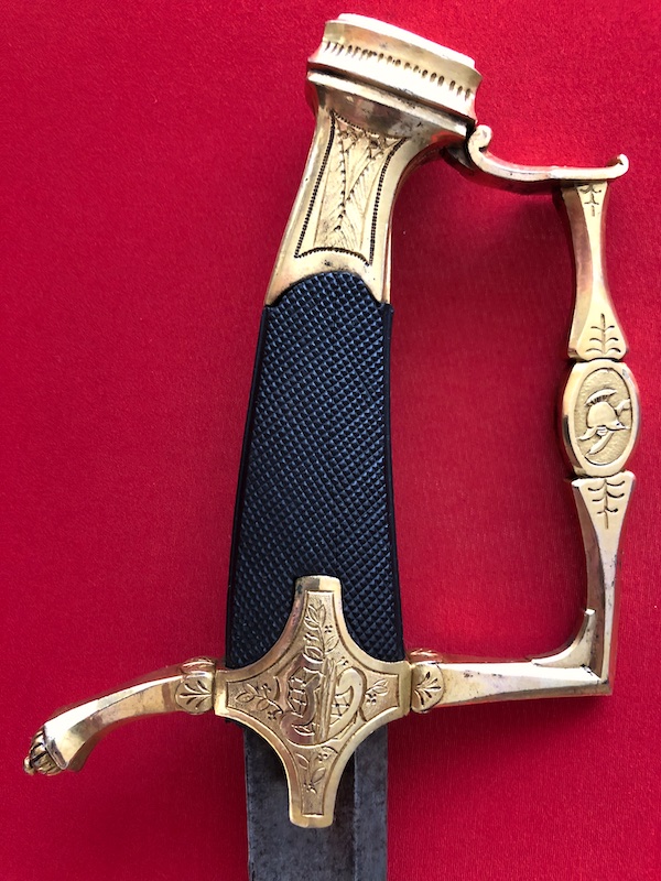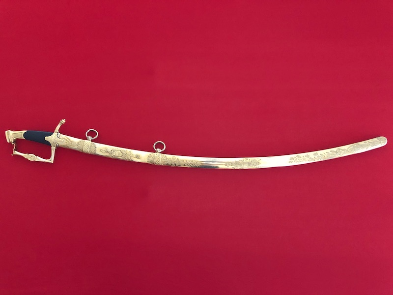 Kräftige, leicht geschwungene Damastklinge à la Montmorency auf beiden Seiten vergoldete Zierätzungen mit kabbalistische Zeichen. Vergoldetes, feindekorierte Messinggefäß mit fein reliefierter Hilze aus Ebenholz. Polierte Messingscheide, terzseitig reich reliefiert mit Trophäen und gepunztem Dekor, zwei bewegliche Trageringe. Der Schlepper fehlt. Gebrauchs- und Altersspuren. Edel gearbeitete Offizierswaffe. Vergoldung in gutem Zustand