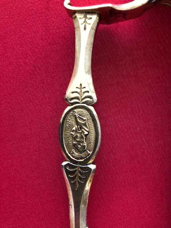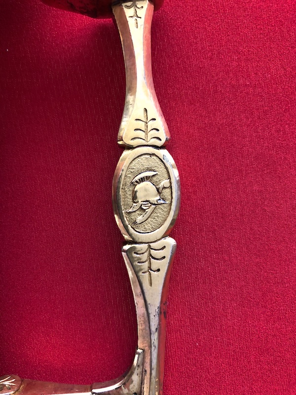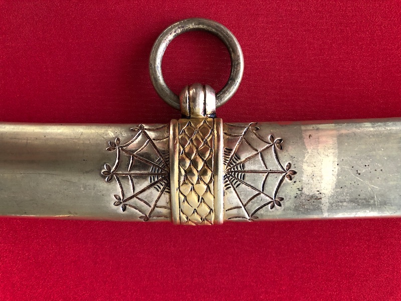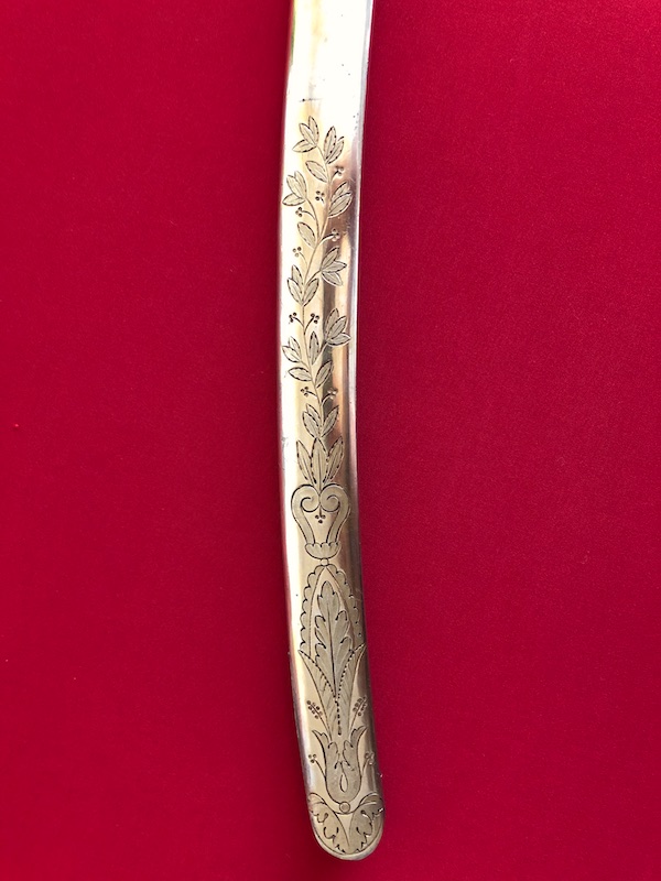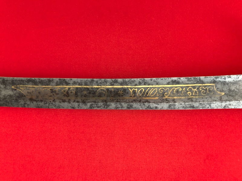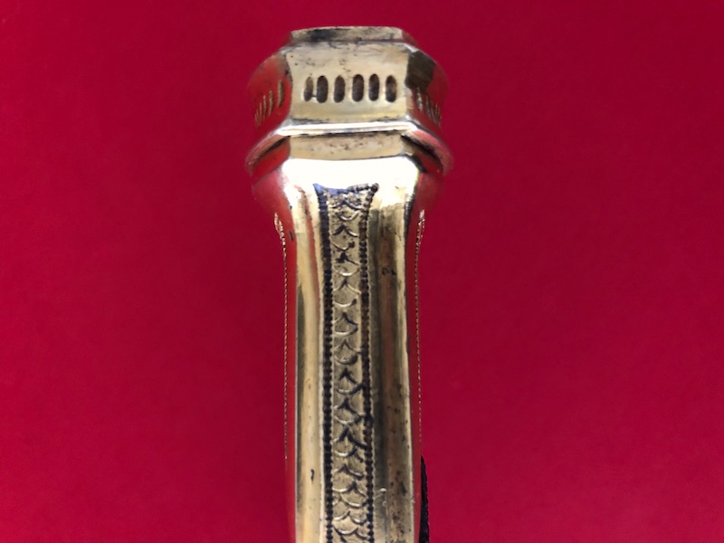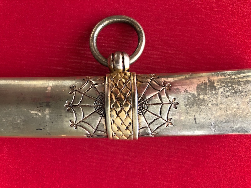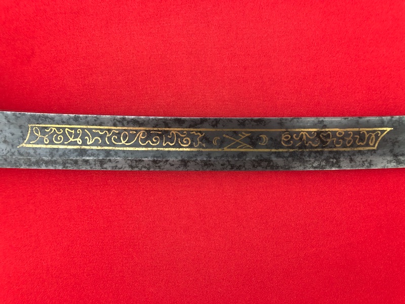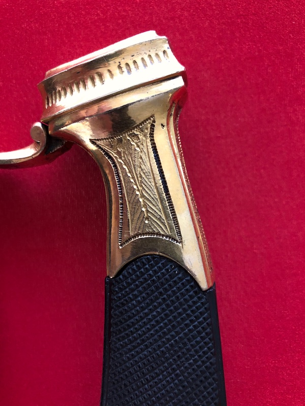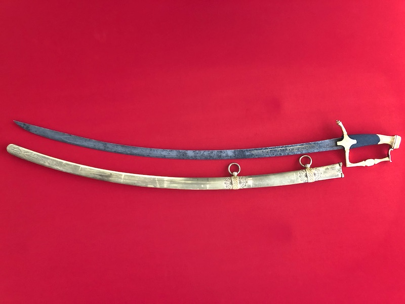 Kräftige, leicht geschwungene Damastklinge à la Montmorency auf beiden Seiten vergoldete Zierätzungen mit kabbalistische Zeichen. Vergoldetes, feindekorierte Messinggefäß mit fein reliefierter Hilze aus Ebenholz. Polierte Messingscheide, terzseitig reich reliefiert mit Trophäen und gepunztem Dekor, zwei bewegliche Trageringe. Der Schlepper fehlt. Gebrauchs- und Altersspuren. Edel gearbeitete Offizierswaffe. Vergoldung in gutem Zustand