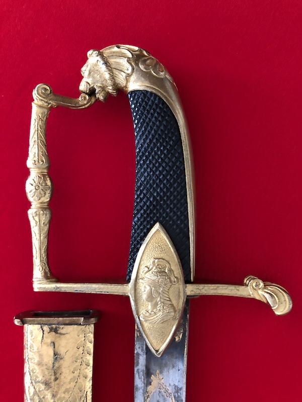 Kräftige, leicht geschwungene Rückenklinge mit beidseitiger Hohlbahn, Jelman und zweischneidiger Spitze, im oberen Drittel beidseitig Zierätzungen mit Ranken und Trophäen. Bügelgefäß aus Messing mit Holzgriff. Messingscheide mit zwei bewegliche Trageringe. Gebrauchs- und Altersspuren. Repräsentative Offizierswaffe.