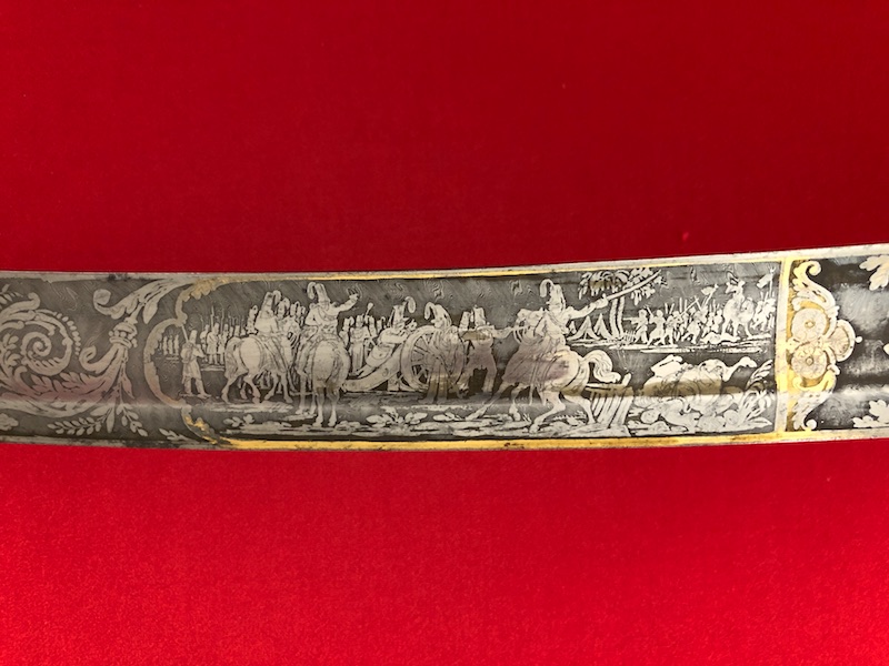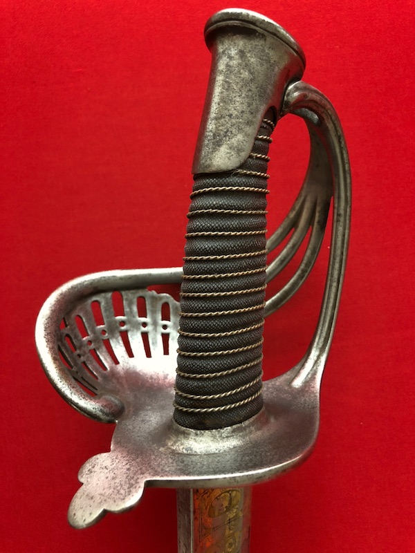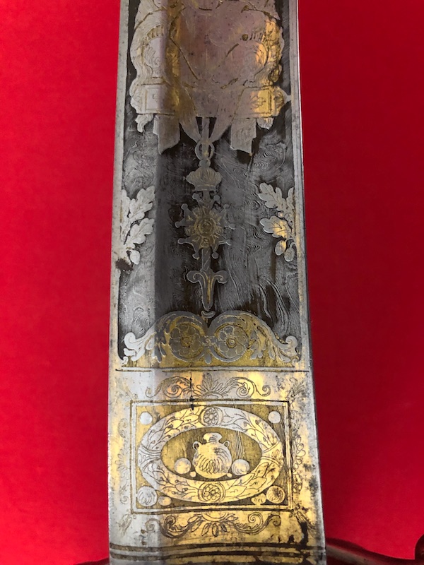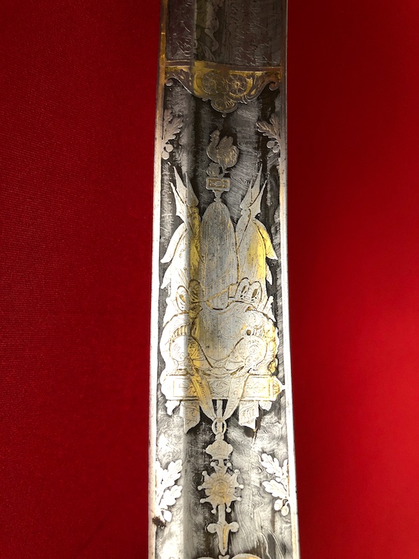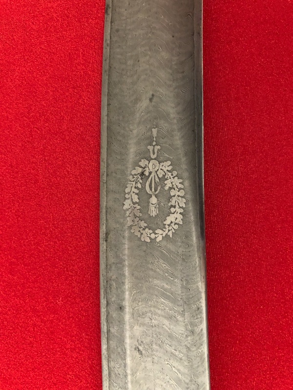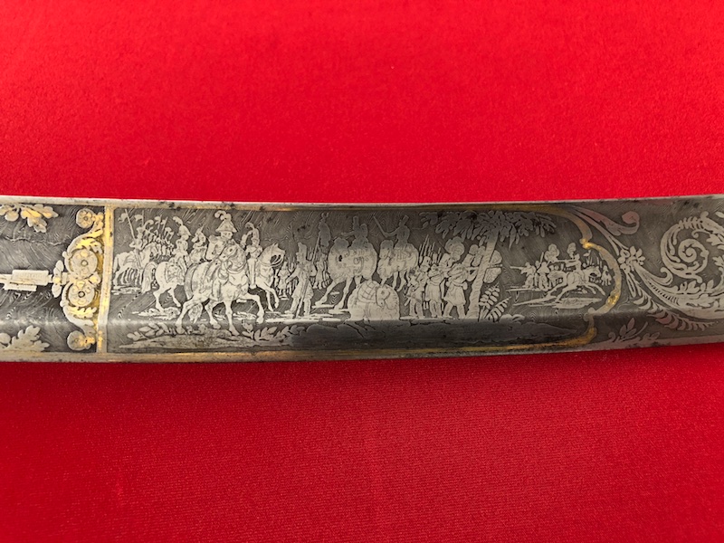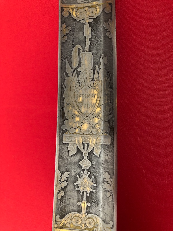 Stahlgefäß, Stahlscheide mit zwei Trageringen. Belederte Hilze (Rochenfischhaut) mit einer Drahtwicklung.Damastklinge geätzt mit vergoldeten Kampf- Szenen, Trophäen, Orden der Ehrenlegion und Devise „Vaterland und Ehre“. Gravierung von Hersteller am Klingenrücken.