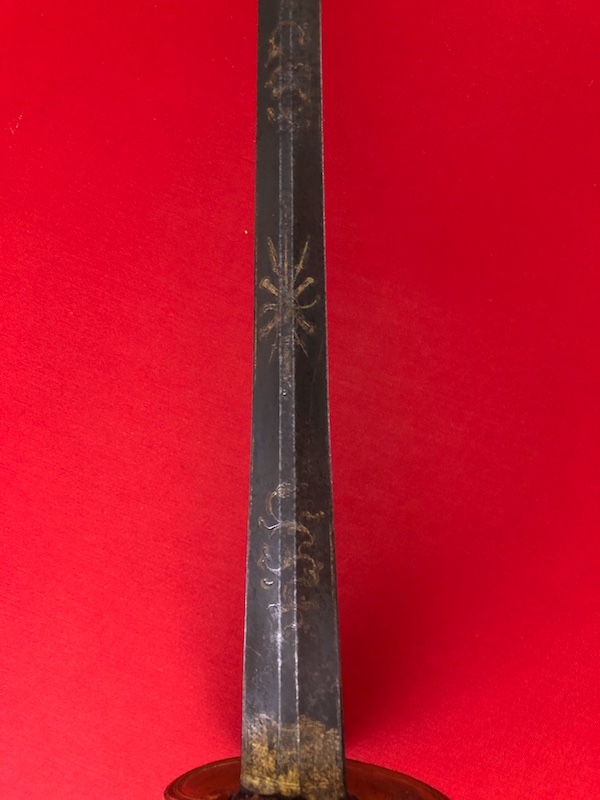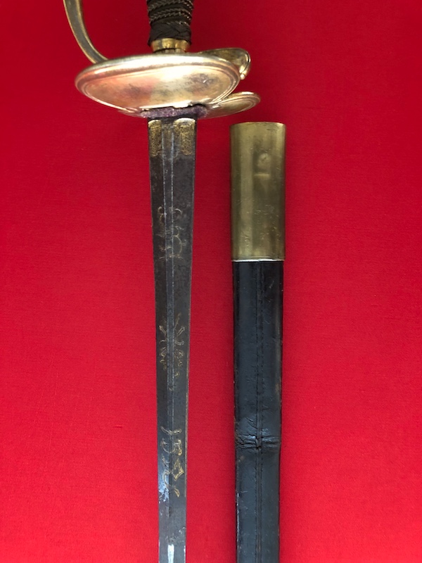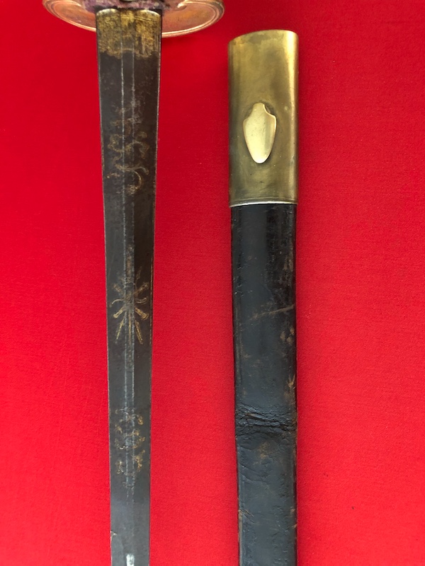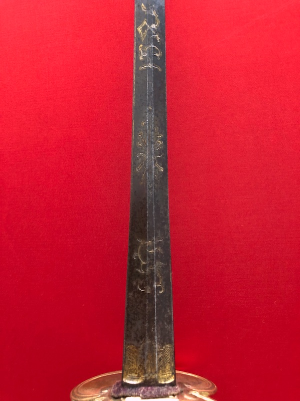 Klinge gebläut und vergoldet. Gefäß vergoldet.Lederscheide mit Messingbeschlägen.