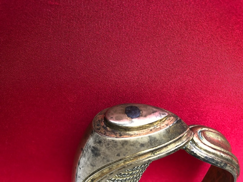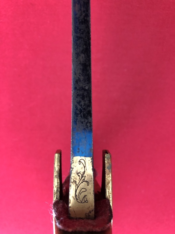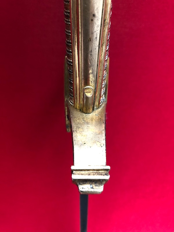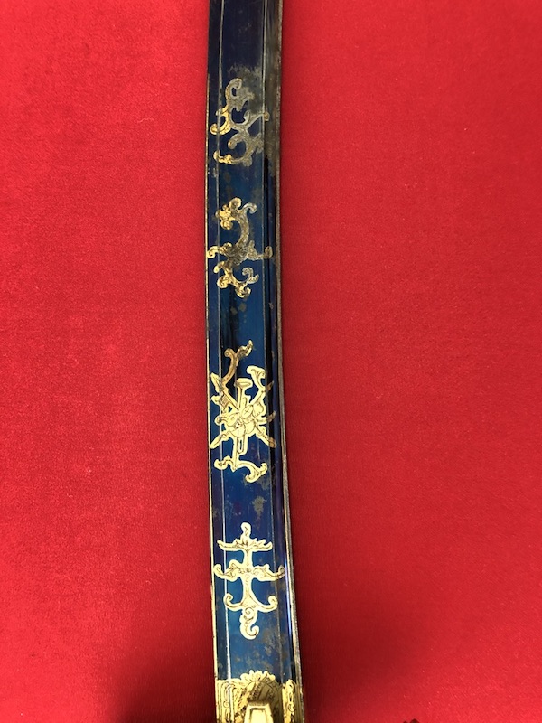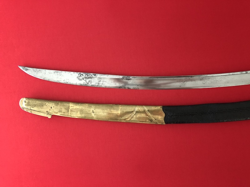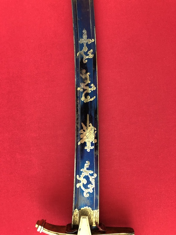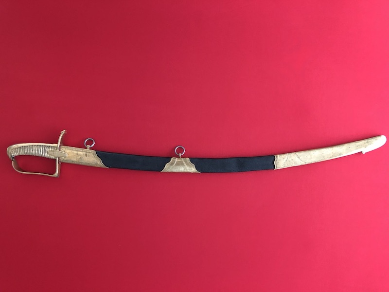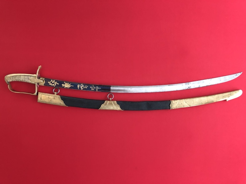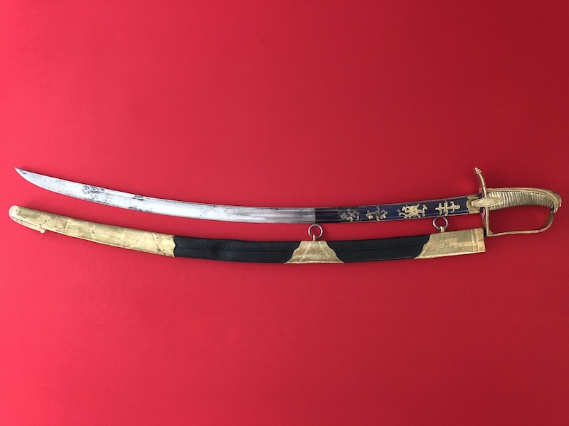 Gekrümmte Klinge mit flacher Hohlkehlung, am Ansatz mit Trophäen und floralen Ornamenten geätzt. Vergoldetes Messingbügelgefäß, lederbezogene Hilze mit Kupferdrahtwicklung. Schwarze Lederscheide mit vergoldeten Messingbeschlägen und mit zwei beweglichen Trageringen.
