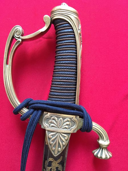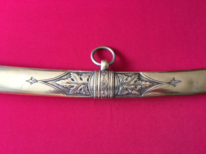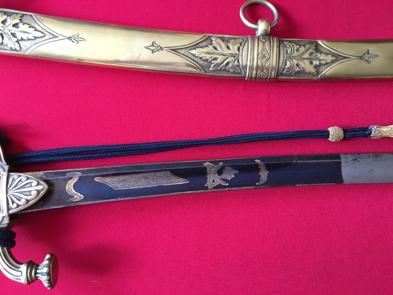 Слегка изогнутый клинок, на 1/3 позолота и синение. Ножны из латуни.
